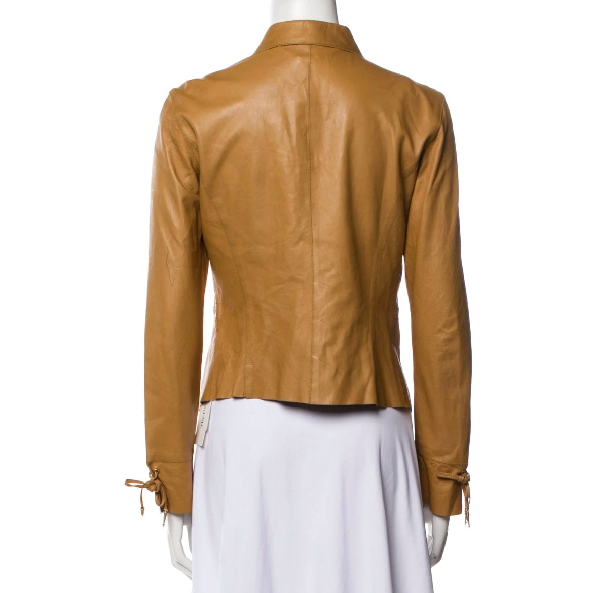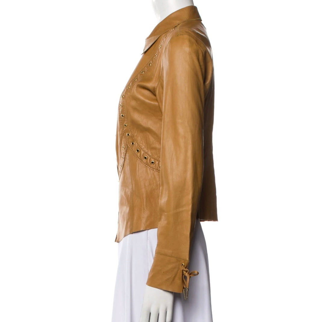 Description - Early 2000's tan leather Roberto Cavalli biker jacket with pointed collar, grommet embellishments throughout, gold tone hardware, embellishment at sleeves and hook closure at front.