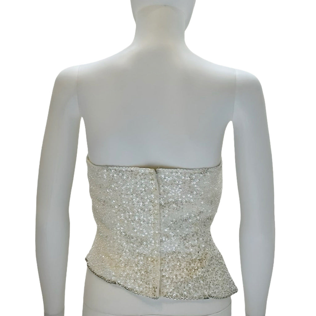 Description - 1990's strapless white top with white/silver beaded/sequin embellishments throughout and zip up closure at back.