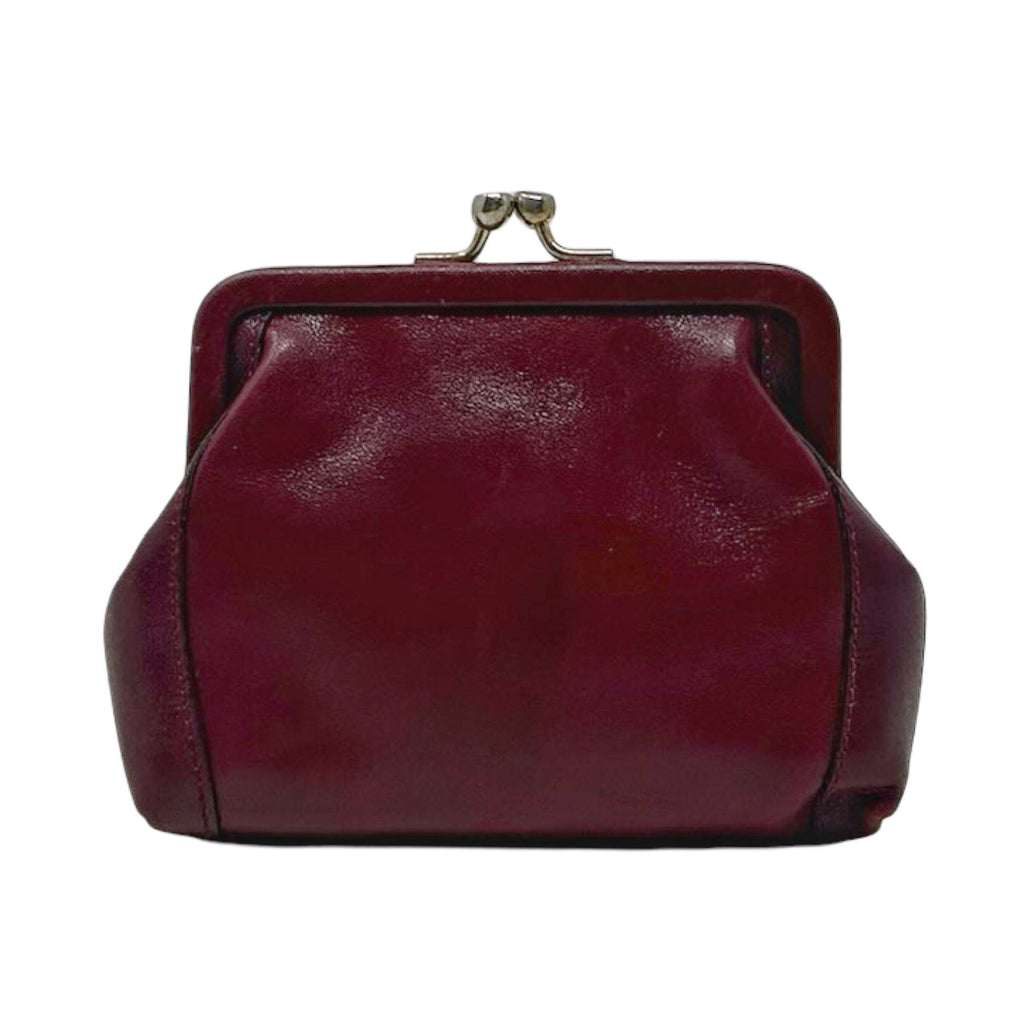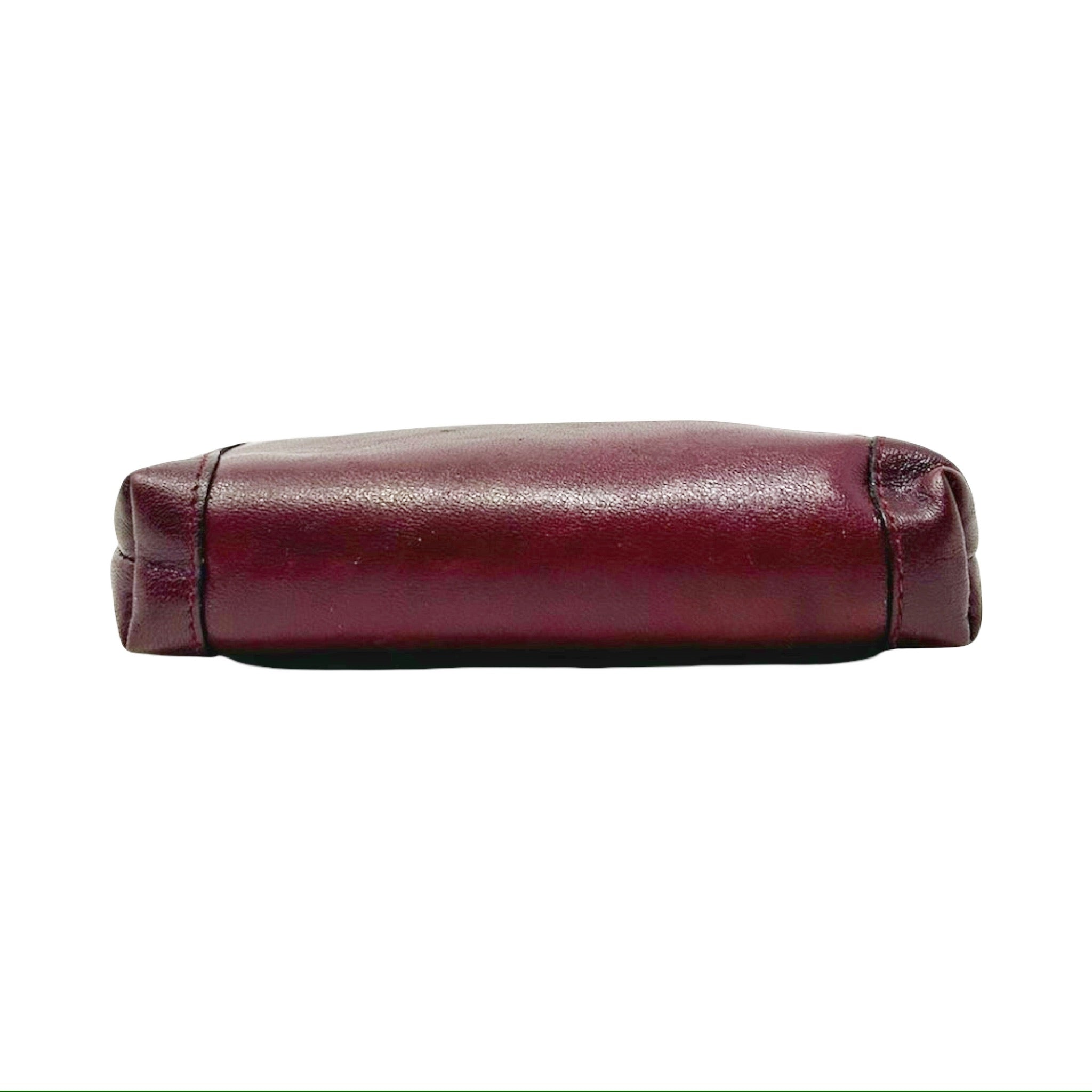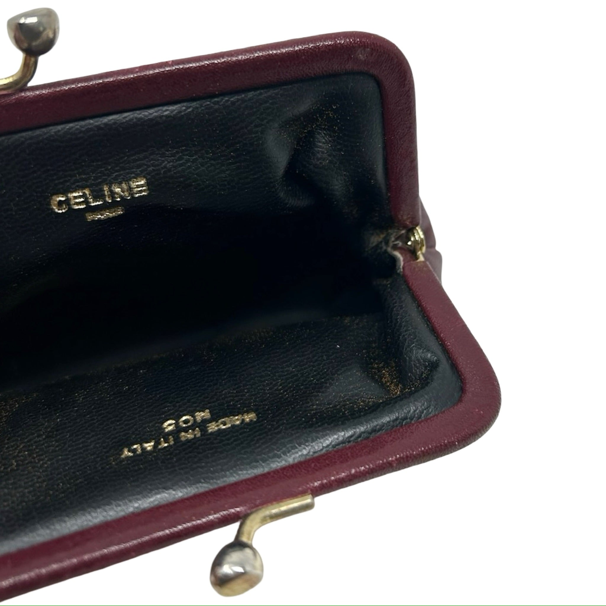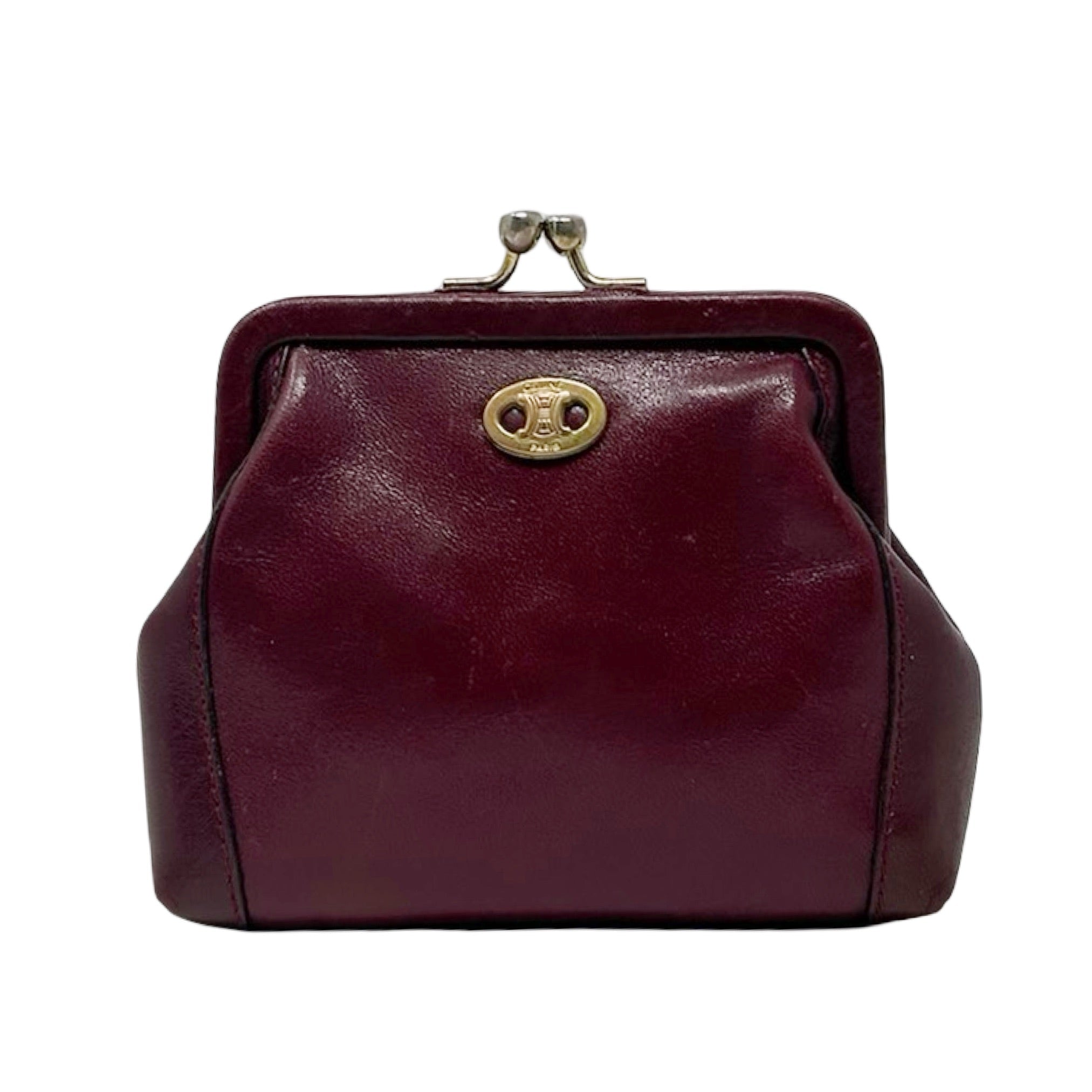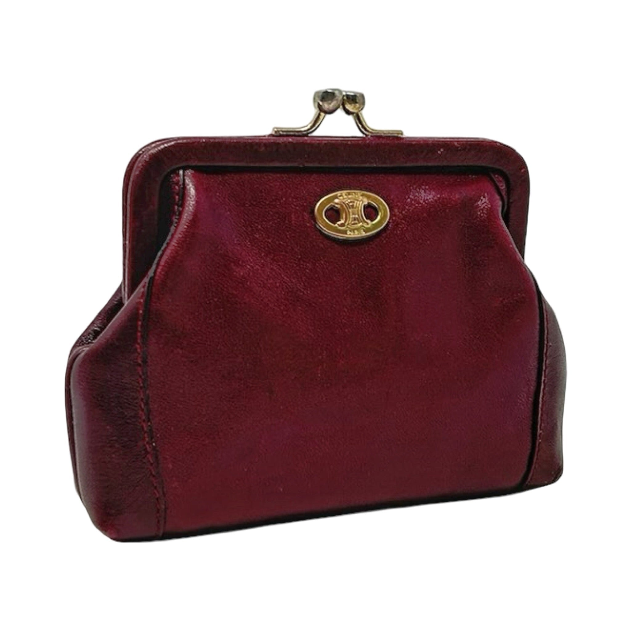 Description - Vintage burgundy leather Celine coin pouch with gold tone hardware, Celine Macadam logo plate at front, and kiss lock closure at top.
