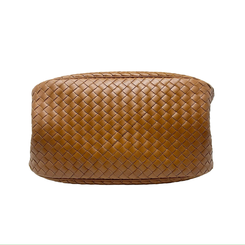 Description - Vintage chestnut brown leather Bottega Veneta Intrecciato shopper bag with dual rolled leather handle straps, magnetic closure at top, dual interior compartments, single interior zip up pouch, gunmetal tone hardware and grey canvas lining.