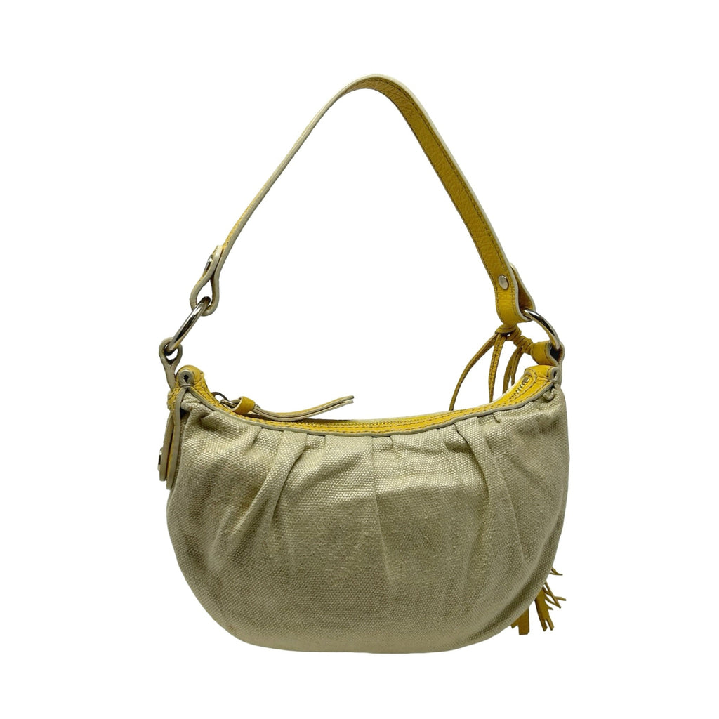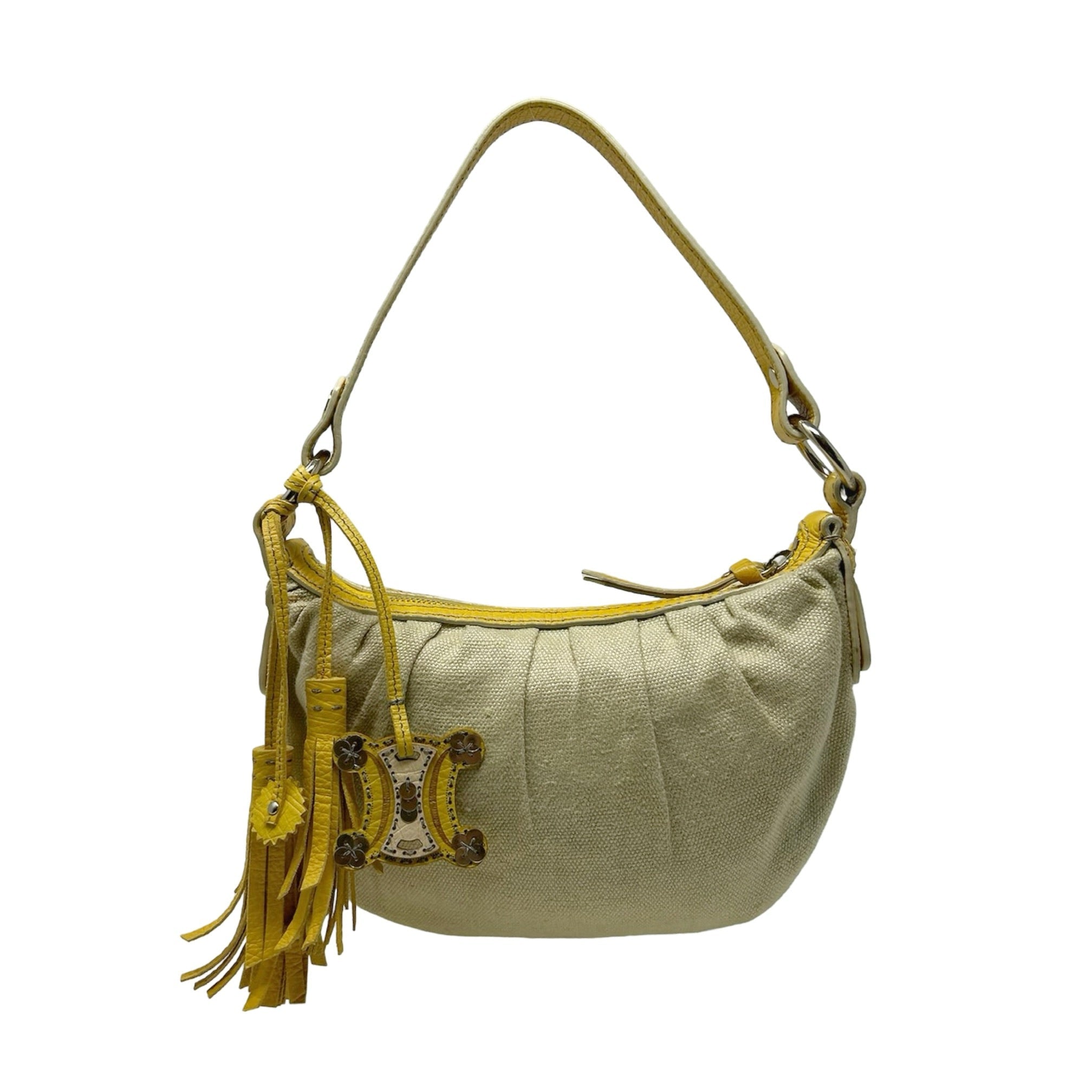 Description: Vintage Celine crescent charm bag in neutral canvas with yellow leather trim, gold tone hardware, tonal leather tassels and sequined macadam charm embellishment. Single flat tonal leather shoulder strap, zip closure at top, single interior slip pocket, and jacquard lining. Designed by Michael Kors for Celine.