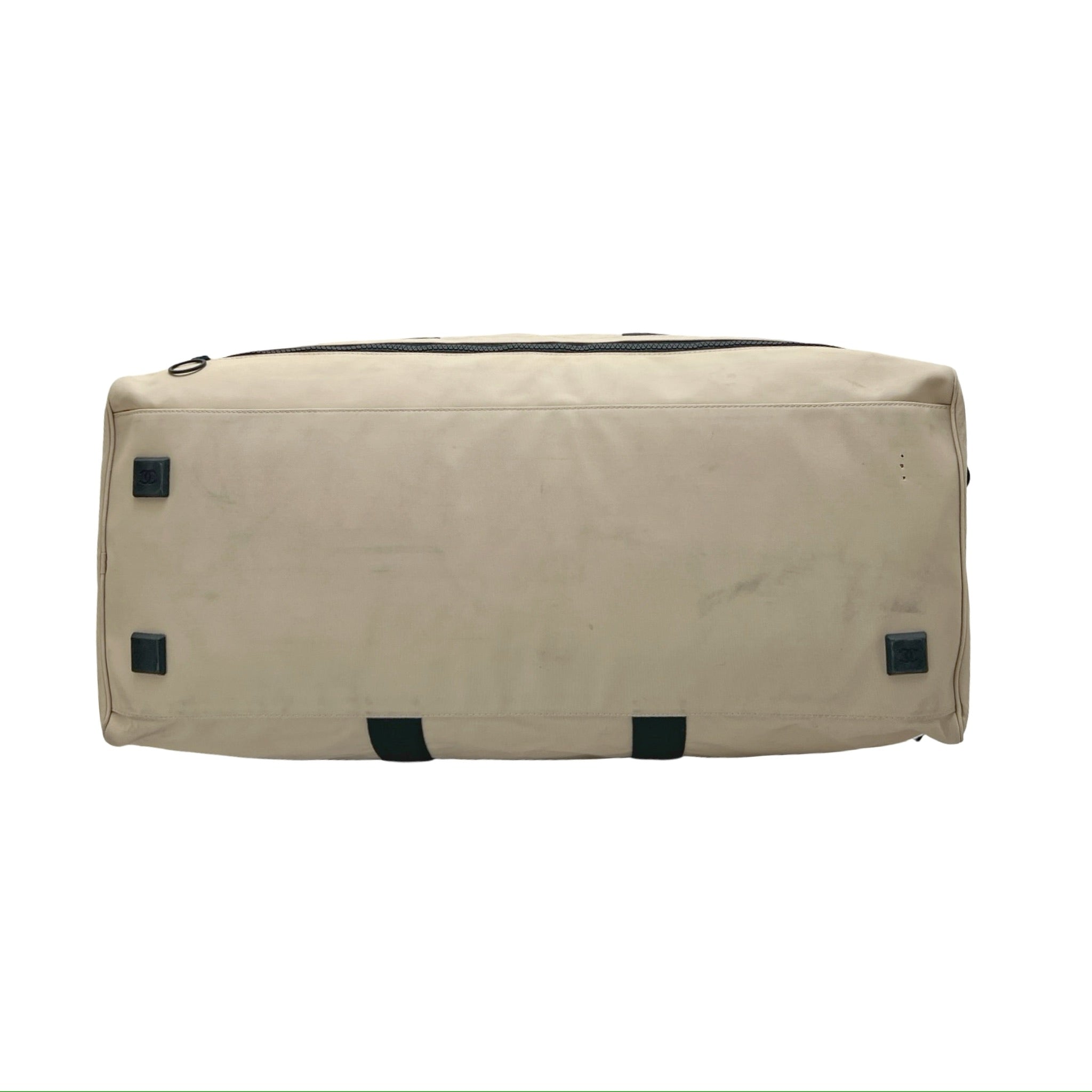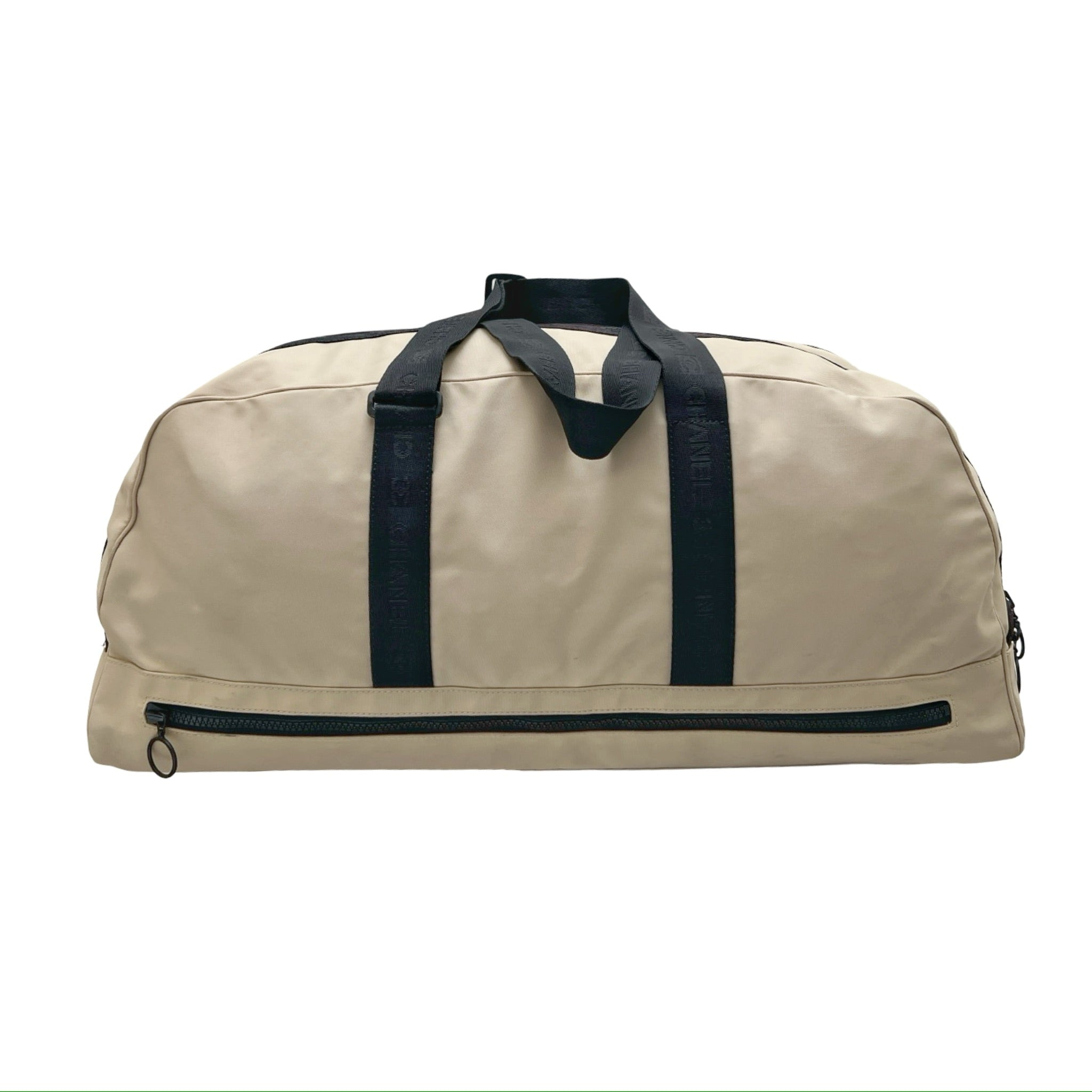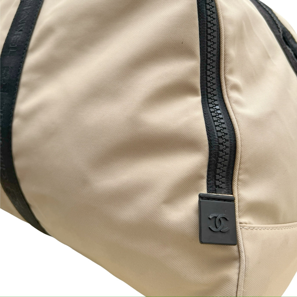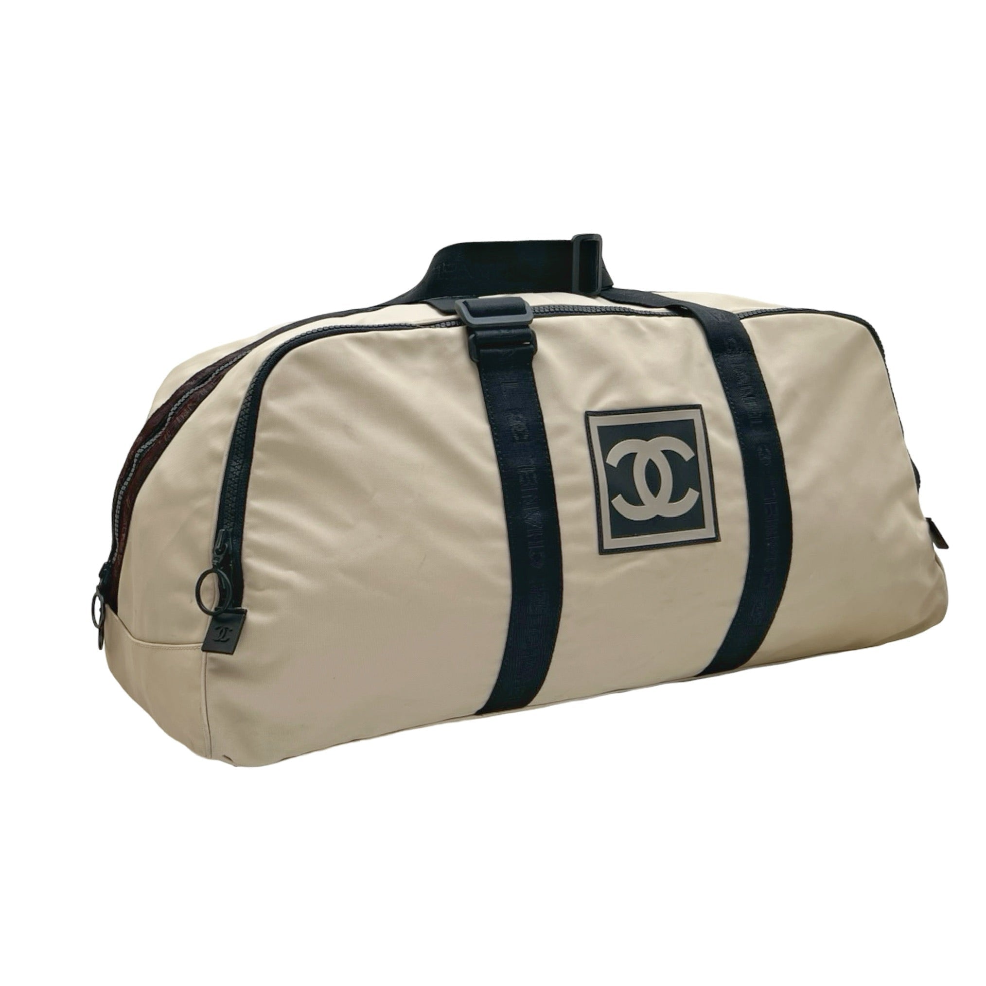 Description - Vintage Chanel Sport cream XL nylon duffle bag with black trim/embellishments, single exterior zip up pocket at front, single exterior zip pocket at back, black hardware, dual  flat adjustable nylon shoulder straps, rubber CC logo plate at front, zip closure at top and jacquard lining.