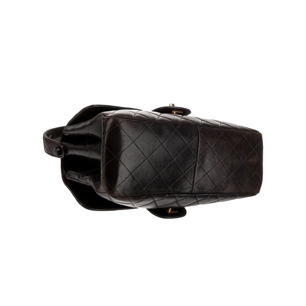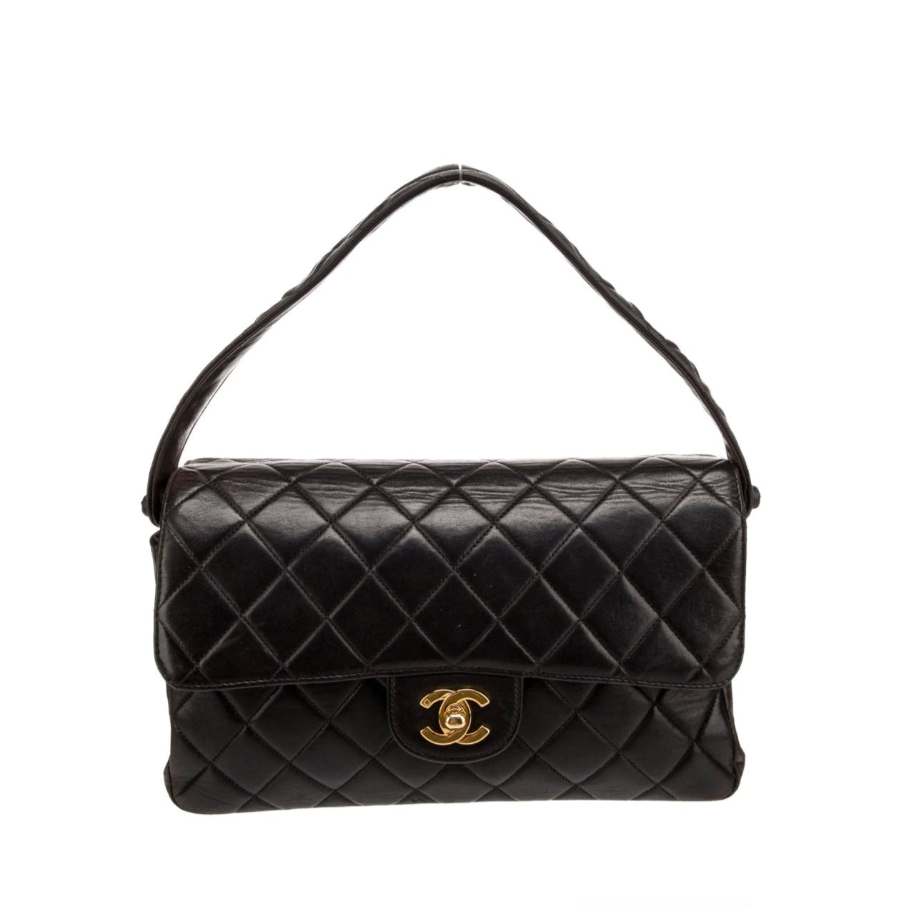 Description - 1990's black quilted leather Chanel top handle bag with gold-tone hardware, single flat handle strap, dual flaps with CC turn lock embellishment closures, tonal leather interior, dual pockets at interior walls - Includes authenticity card.