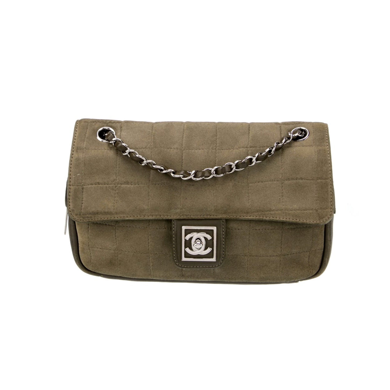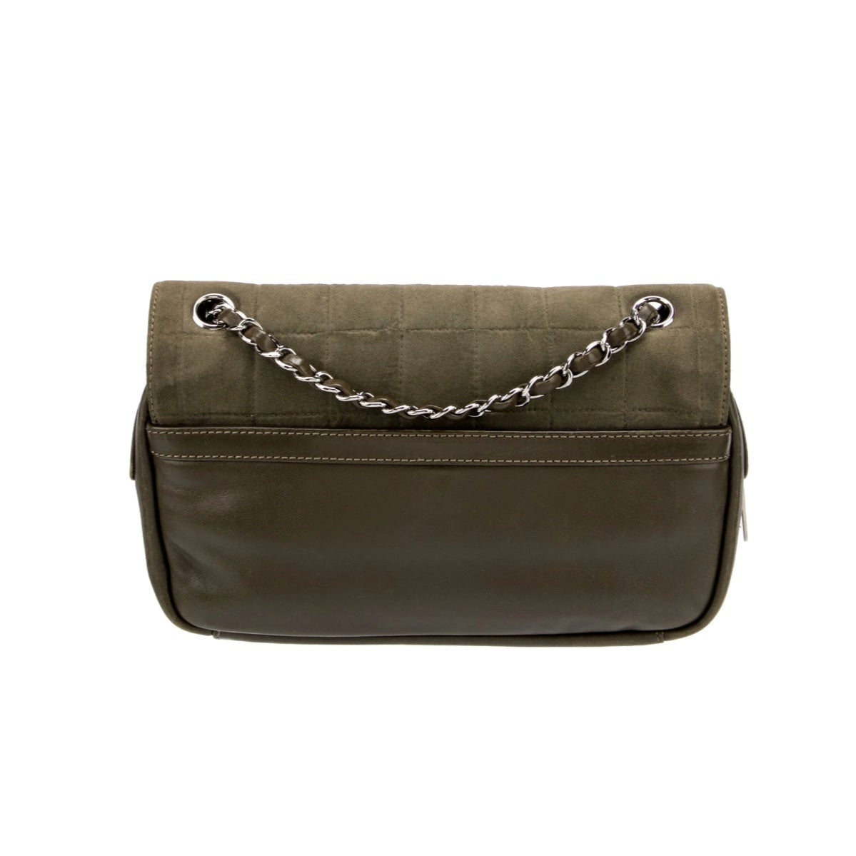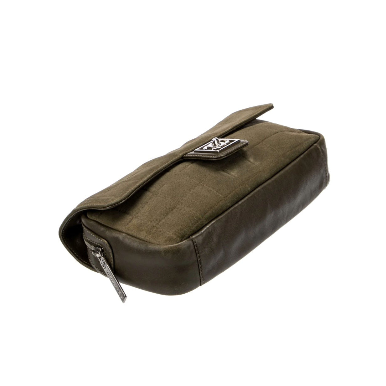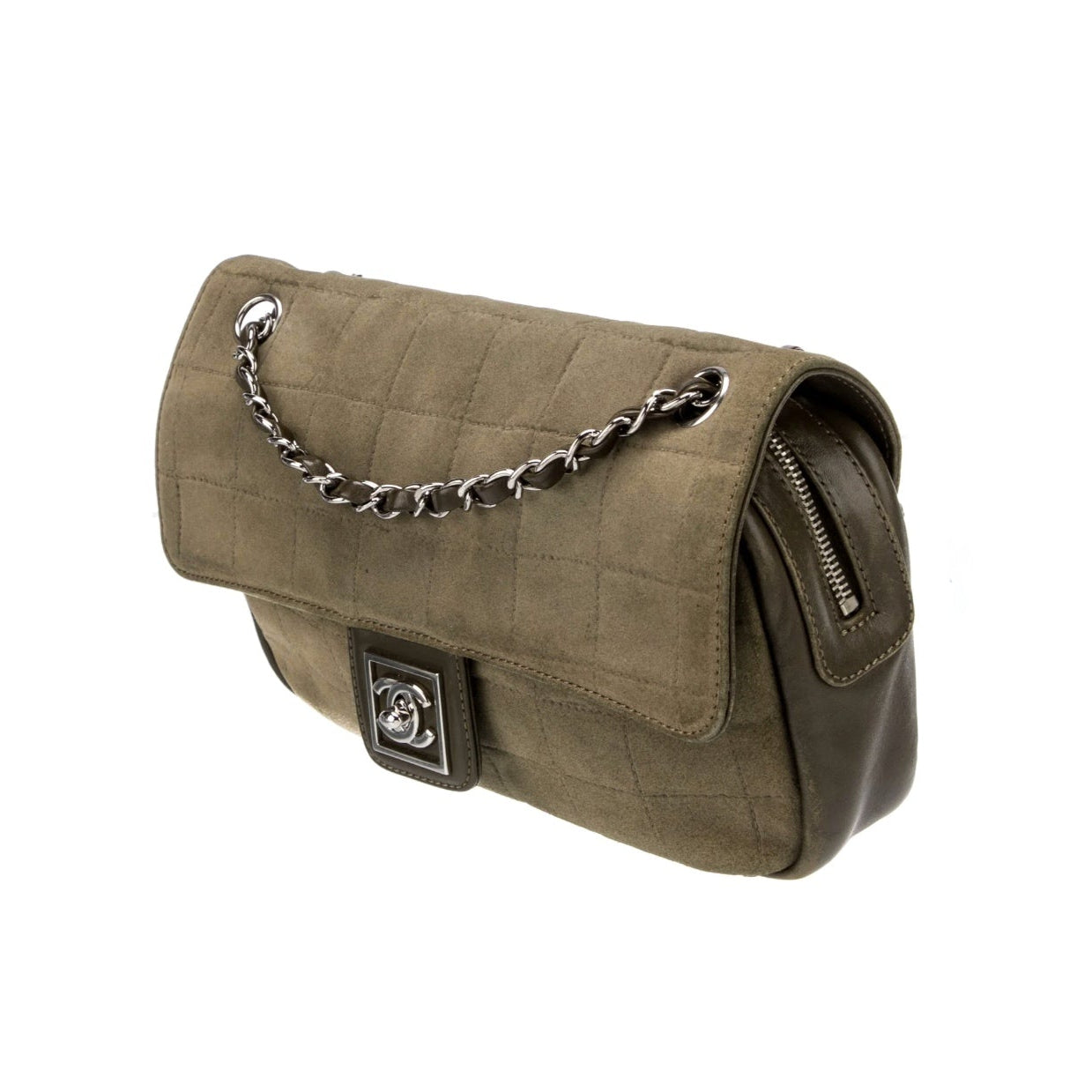 Description - Mid 2000's Chanel Sport chocolate bar flap bag in green suede with silver tone hardware, interlocking CC logo at front, chain link accents, chain link shoulder strap, leather trim, single exterior pocket, turn lock closure at front, nylon lining with single interior pocket.