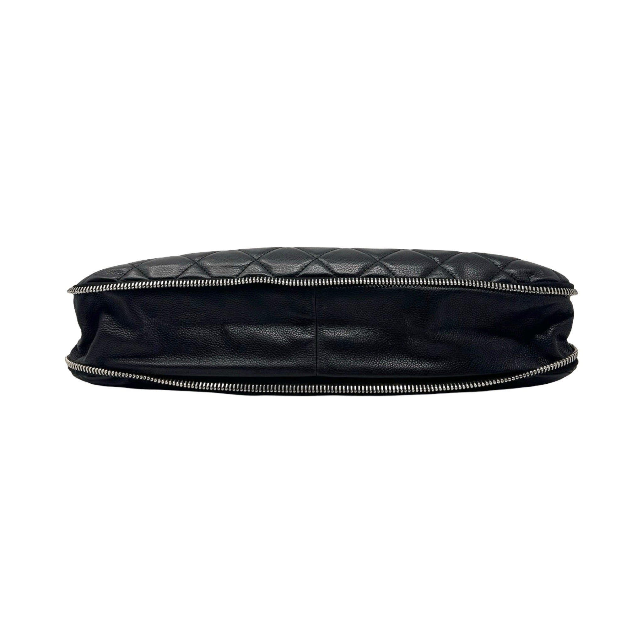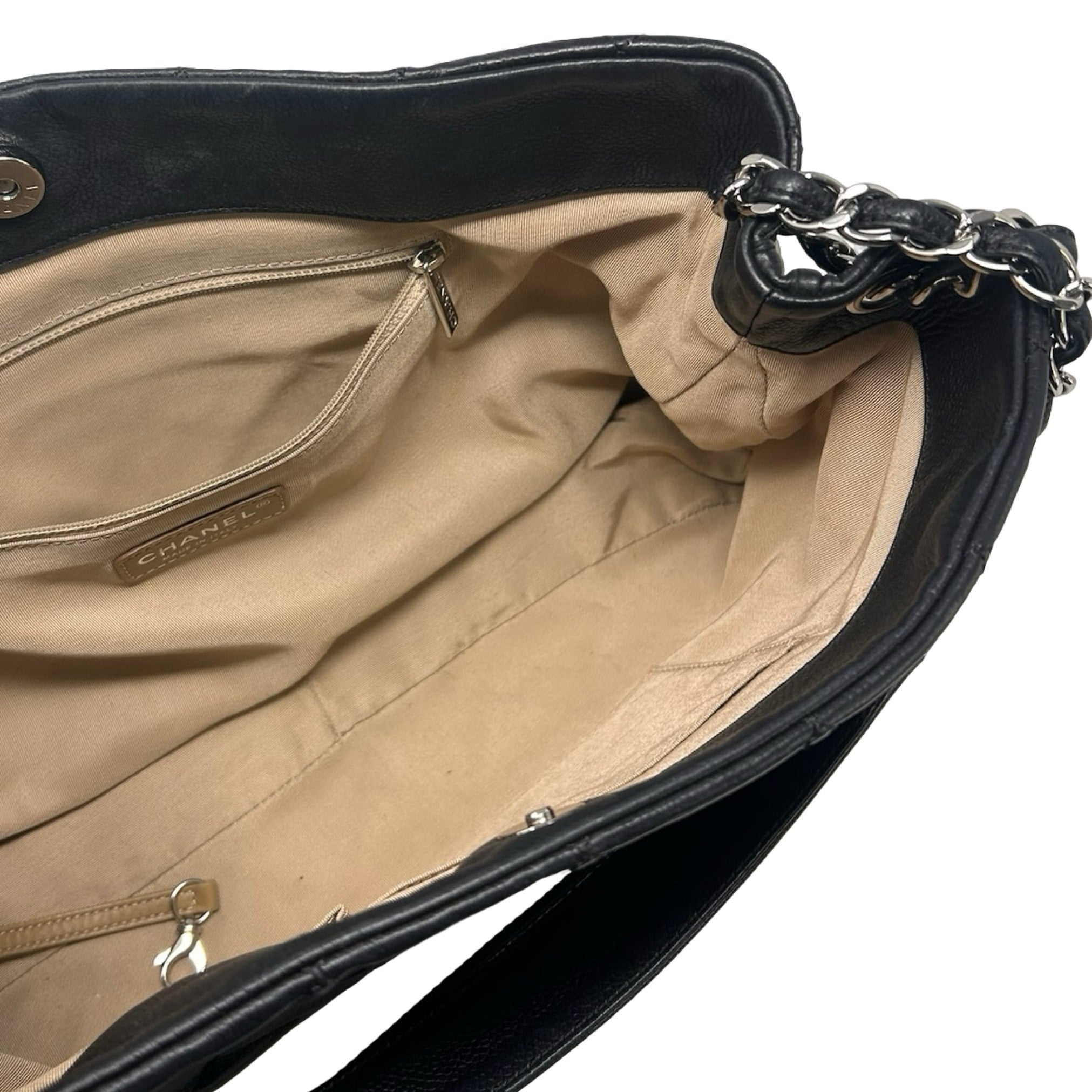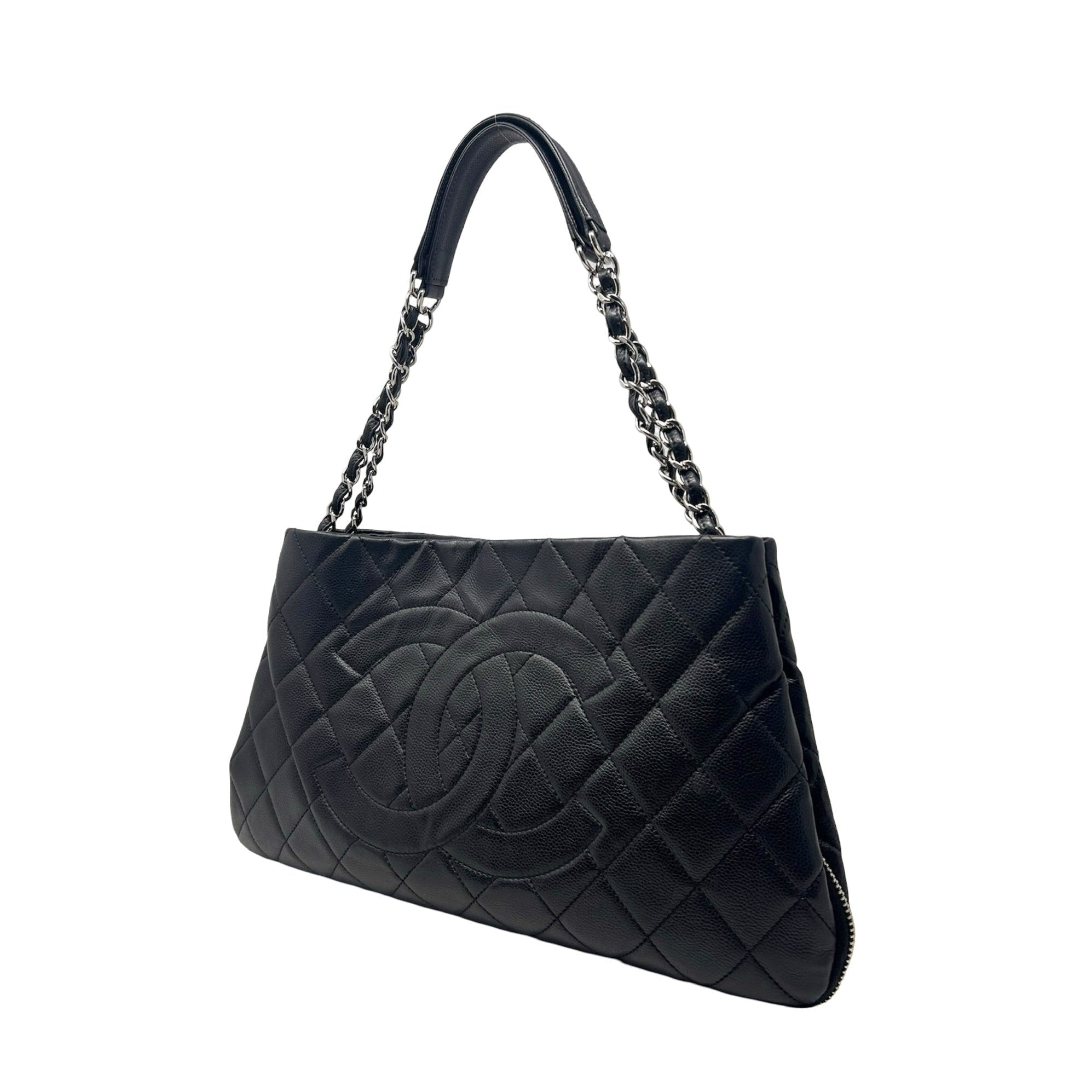 Description - 2000's Chanel black quilted caviar leather Timeless CC Expandable tote bag with silver-tone hardware, curb chain straps with leather shoulder guards, CC embroidery at front, dual interior slip pockets, single interior zip pocket, magnetic closure at top and zip around extendable feature on base.