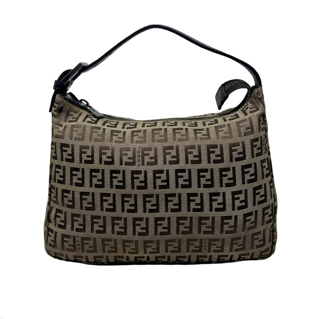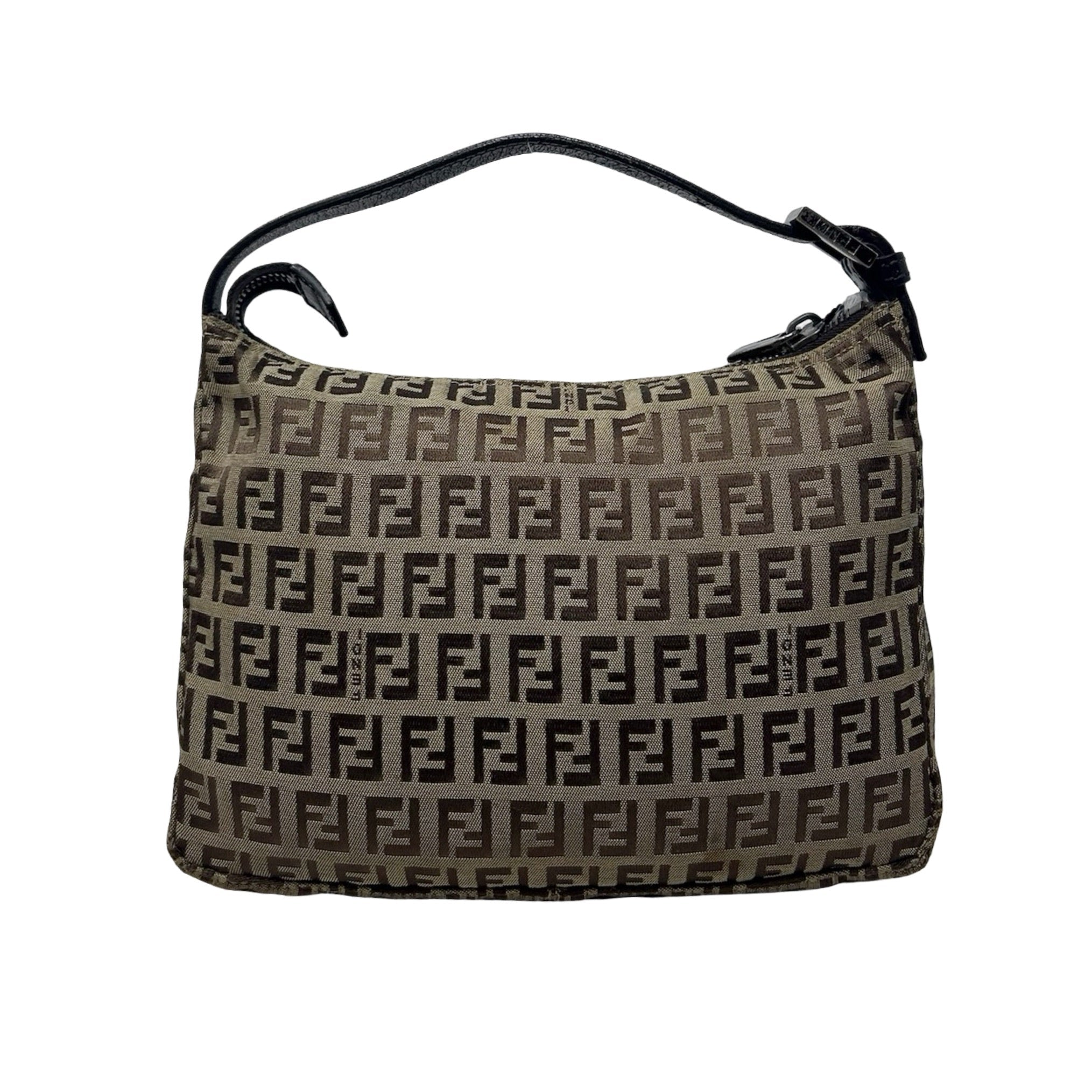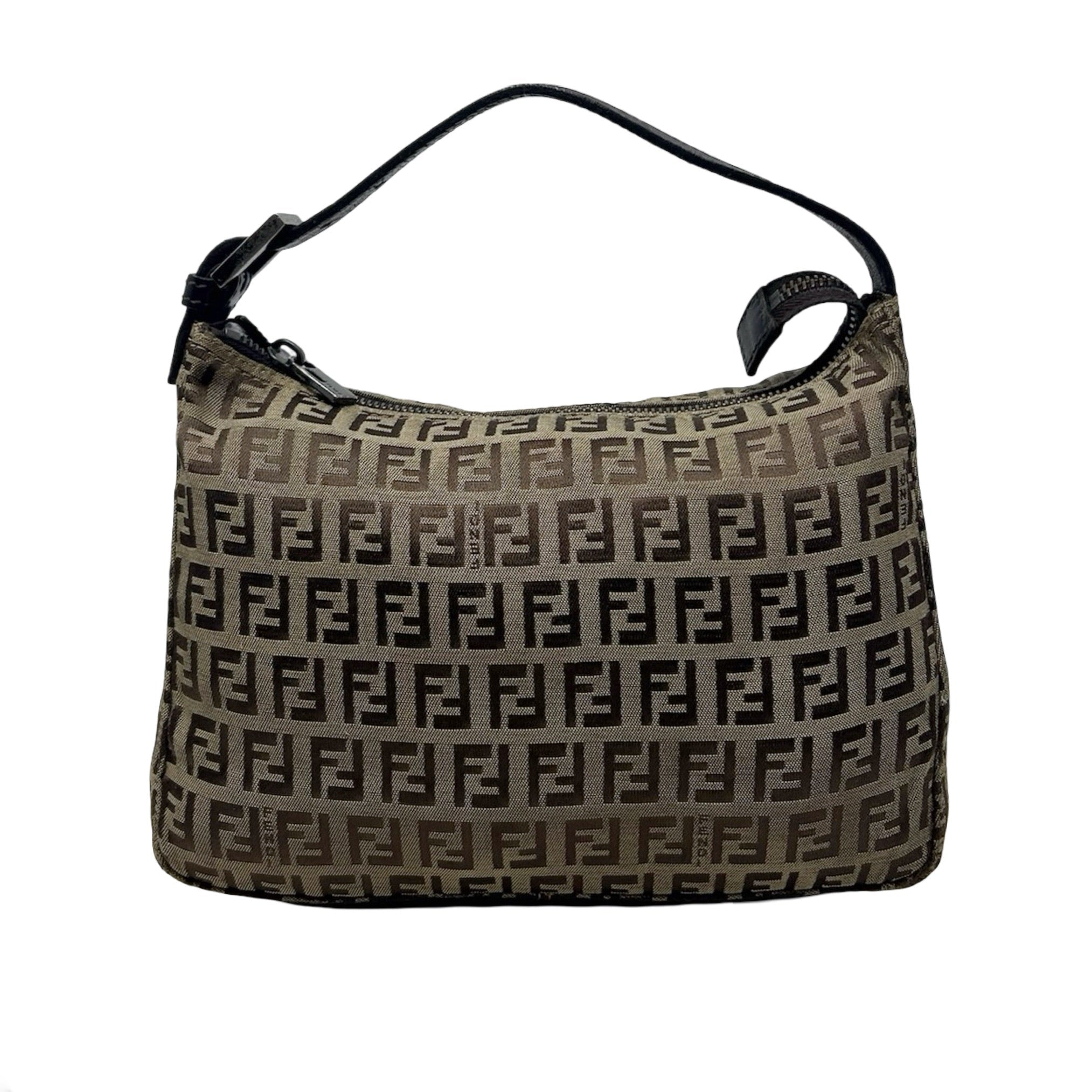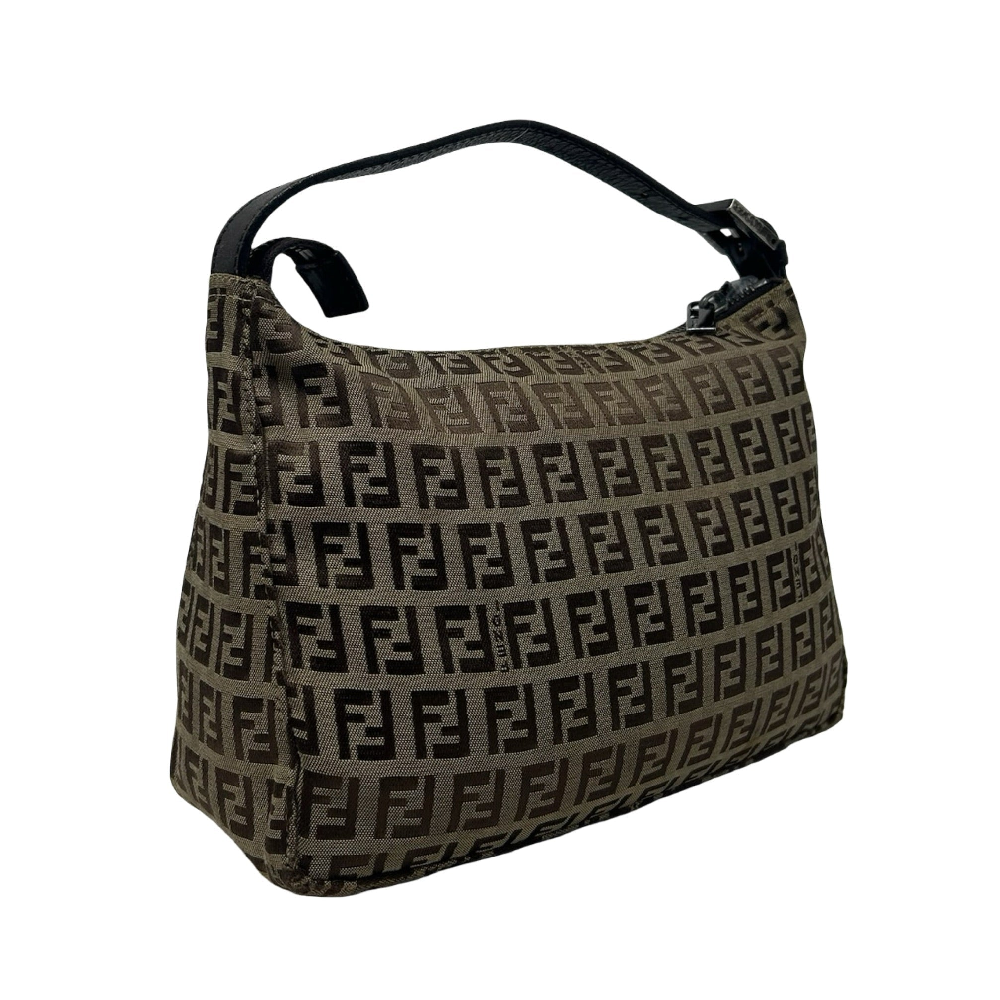 Description - Early 2000's top handle brown Fendi Zucchino monogram print canvas mini hobo bag with single flat adjustable brown leather top handle, zip closure at top and gun metal hardware.