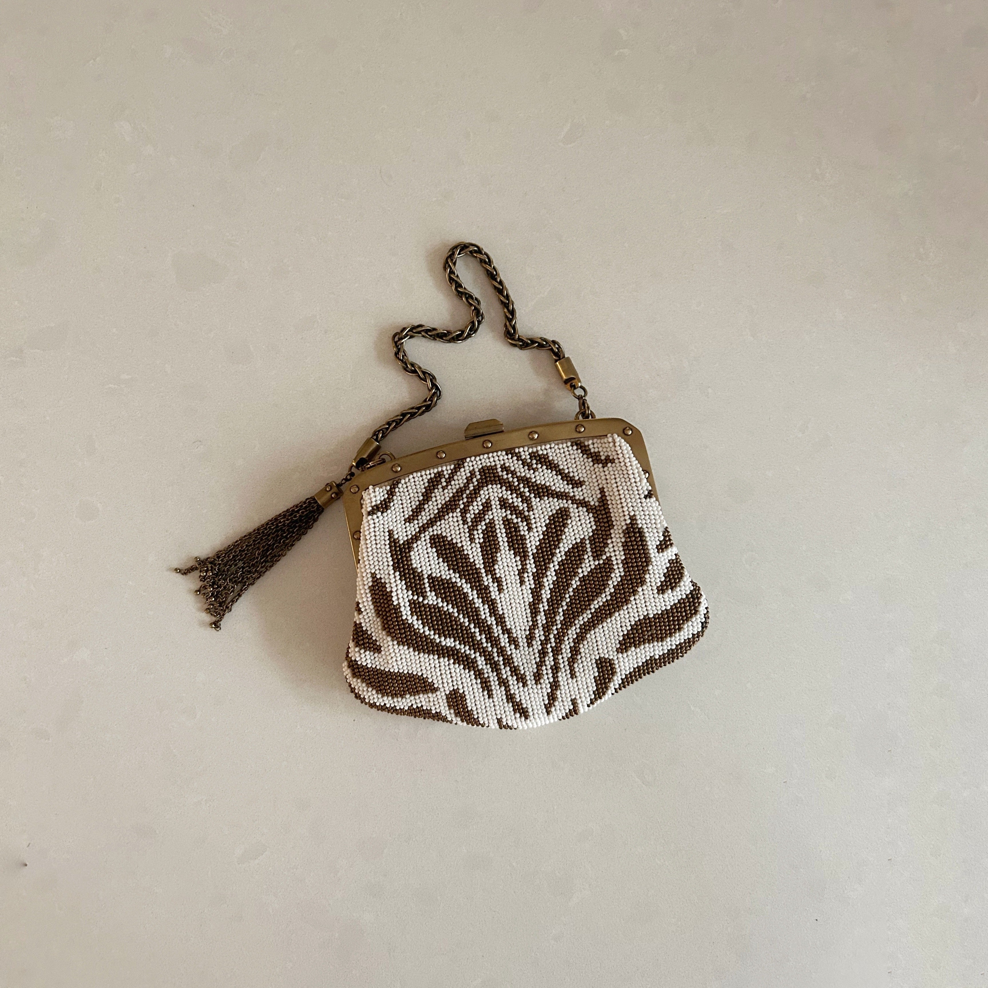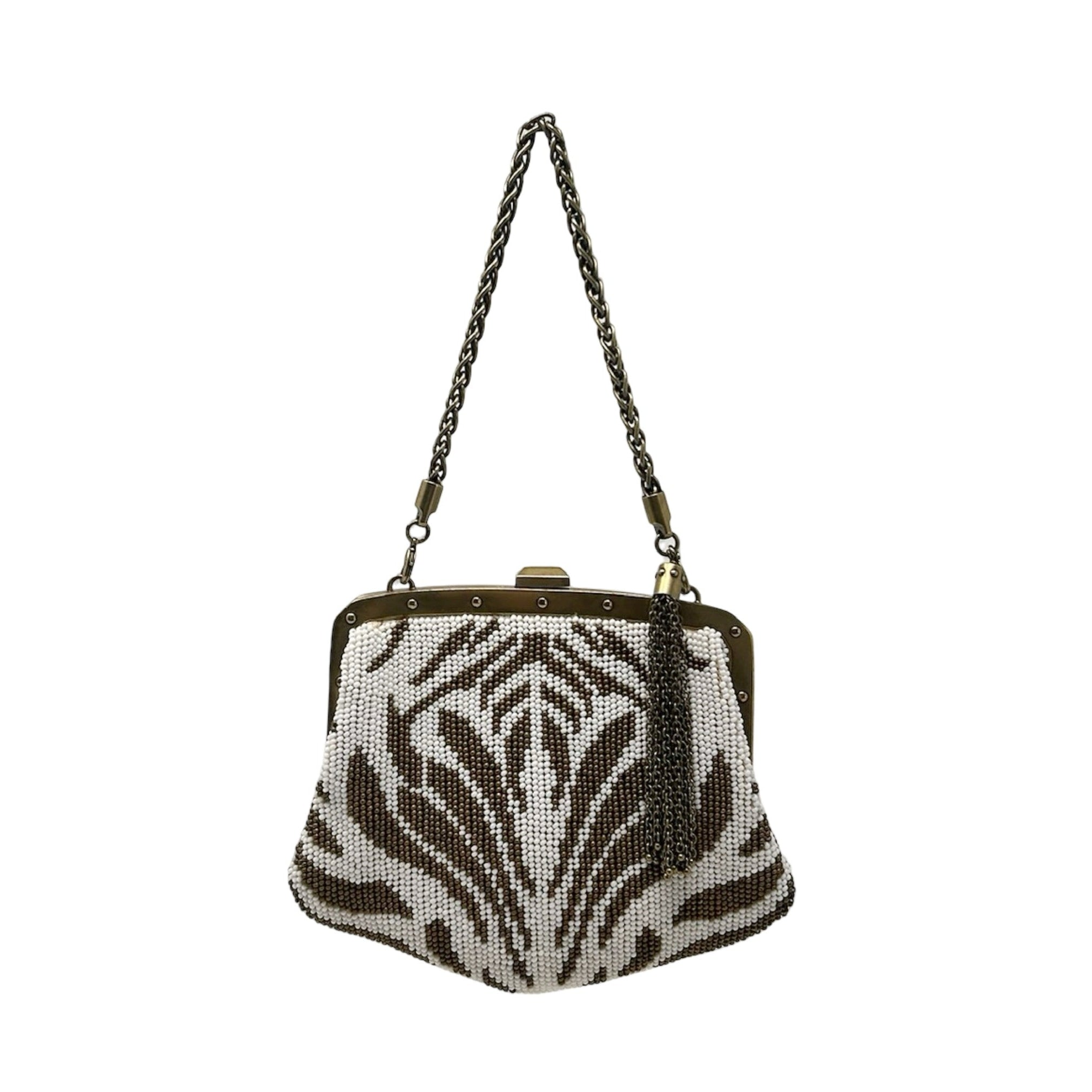 Description - Vintage rare white silk Gucci embellished frame evening bag with white and gold beaded embellishments throughout, push lock closure at top, gold leather interior with single interior slip pocket, gold tone hardware and singular rolled chain shoulder strap with tassel embellishment.