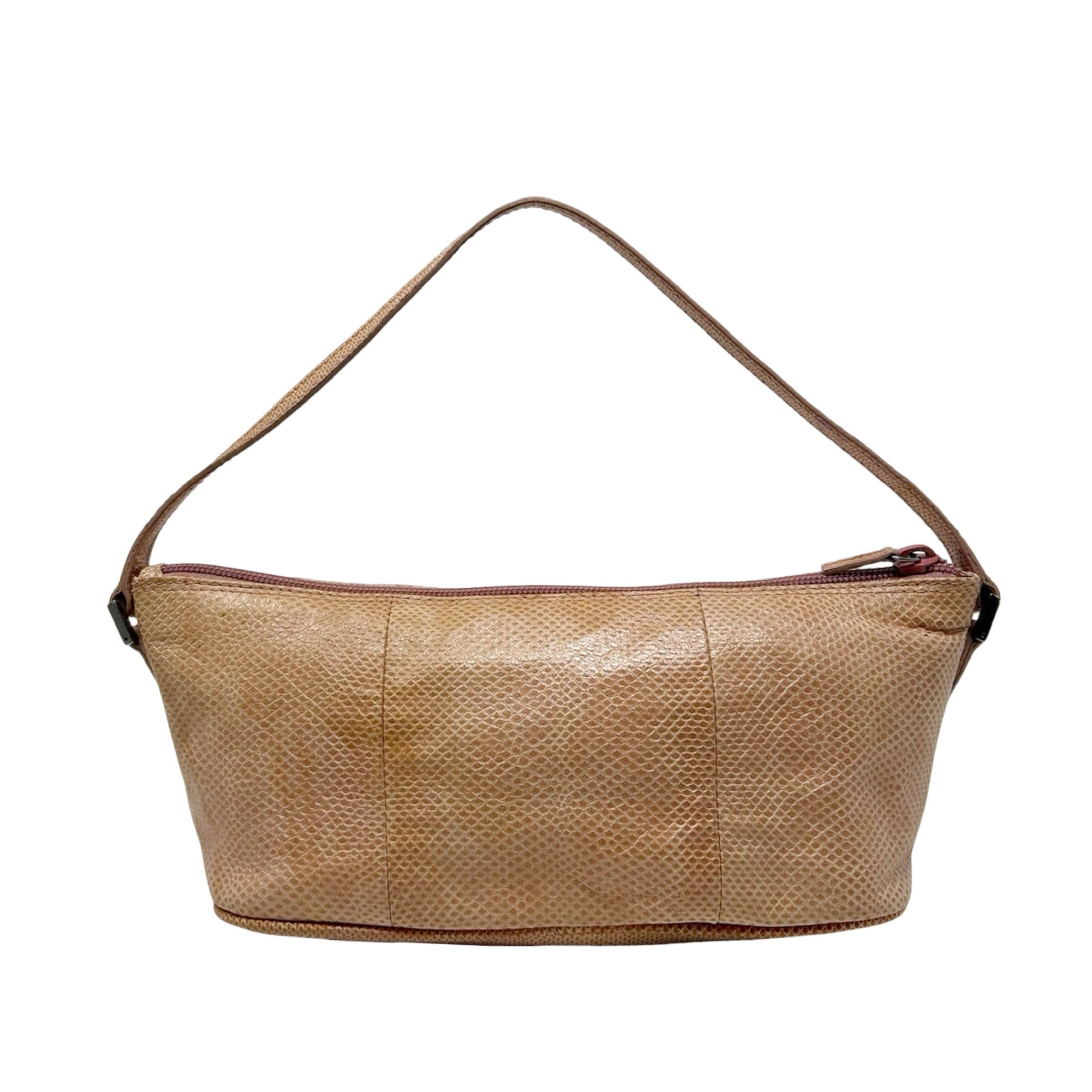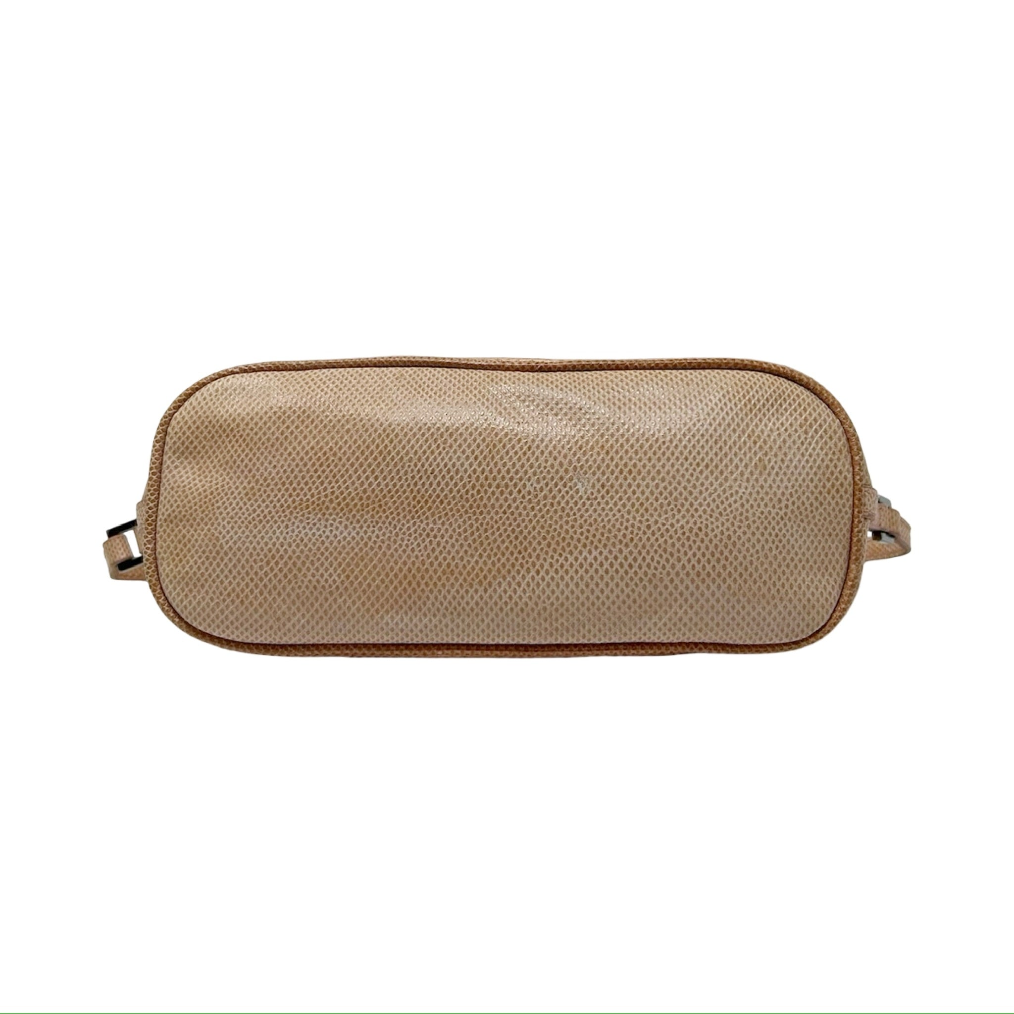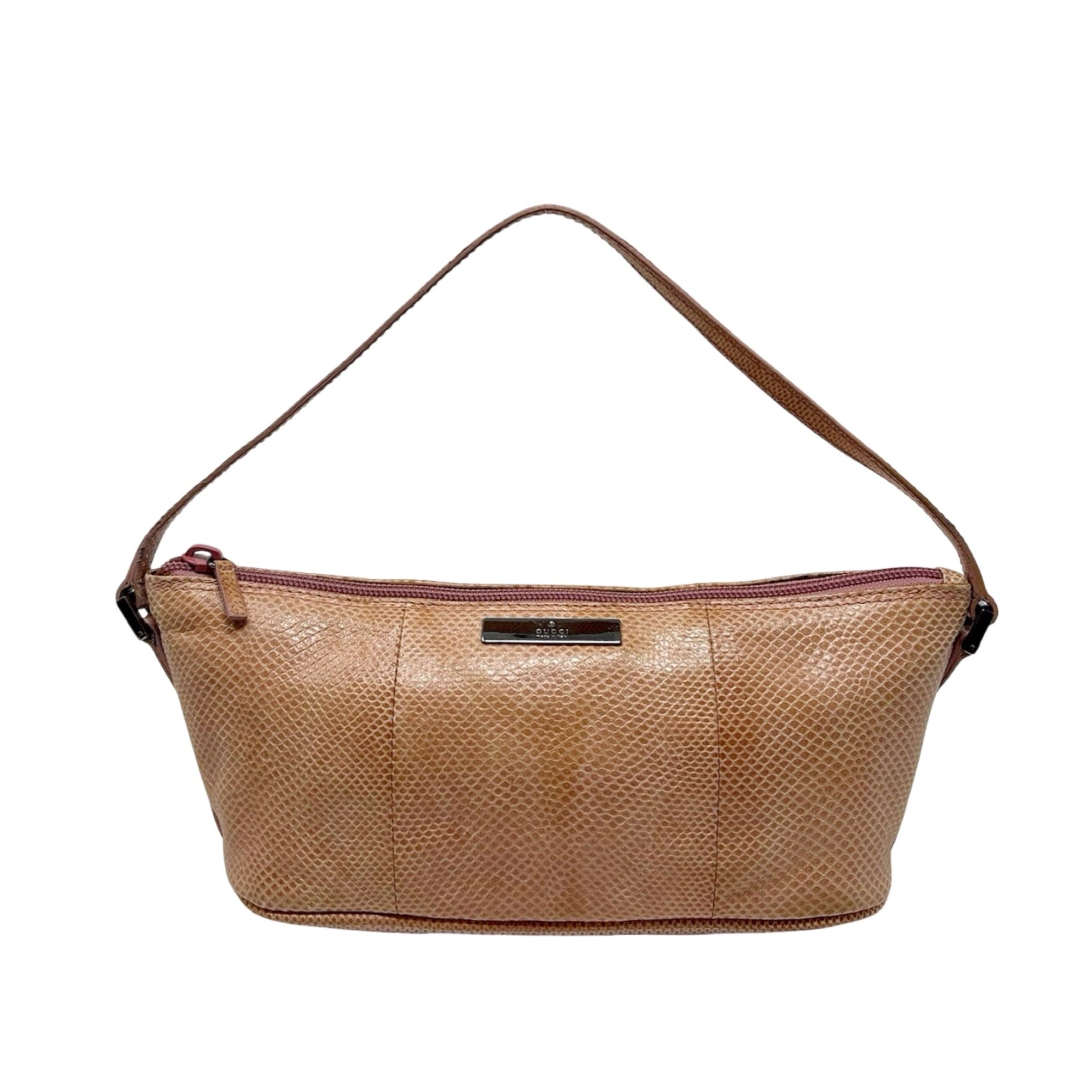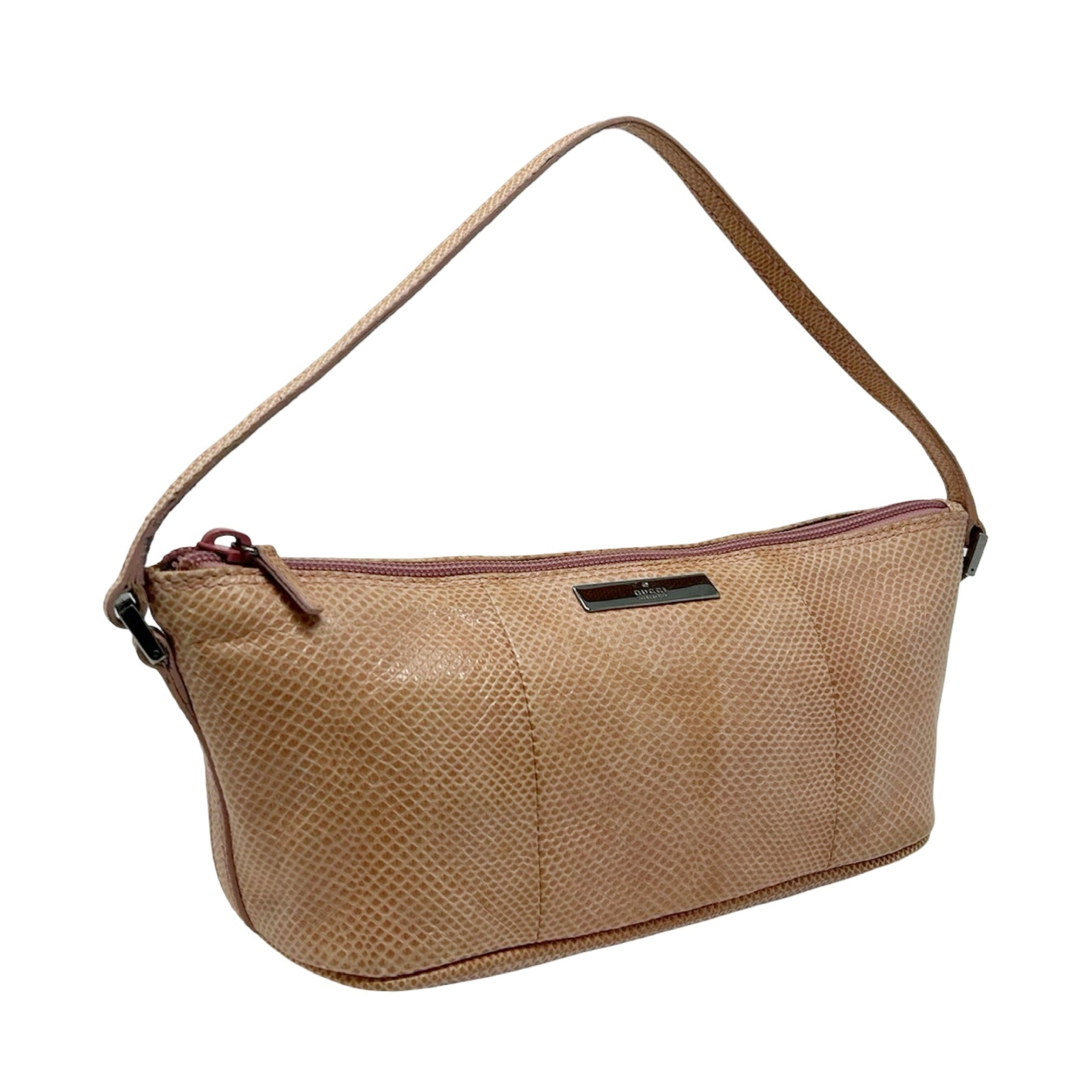 Description - Vintage neutral lizard leather Gucci Boat pochette bag with silver tone hardware, single flat tonal leather handle, jacquard lining and zip closure at top.