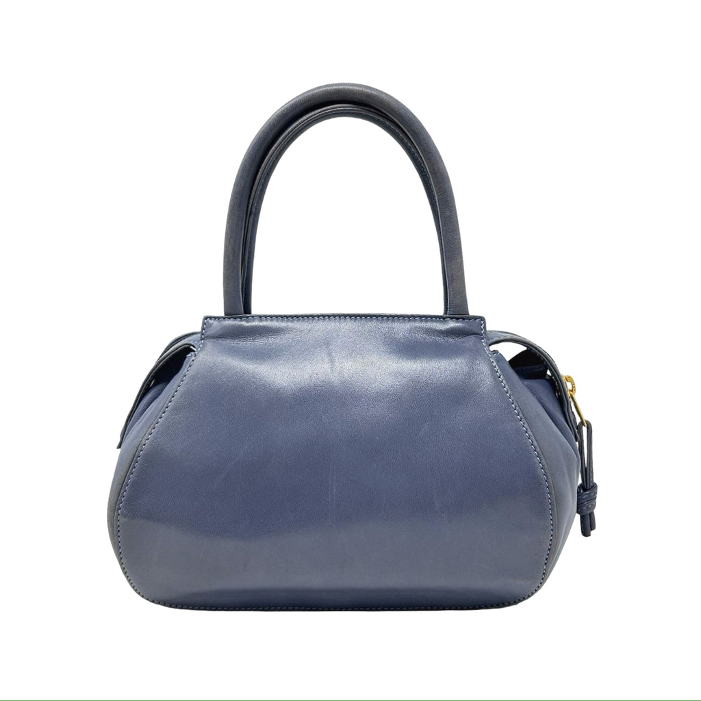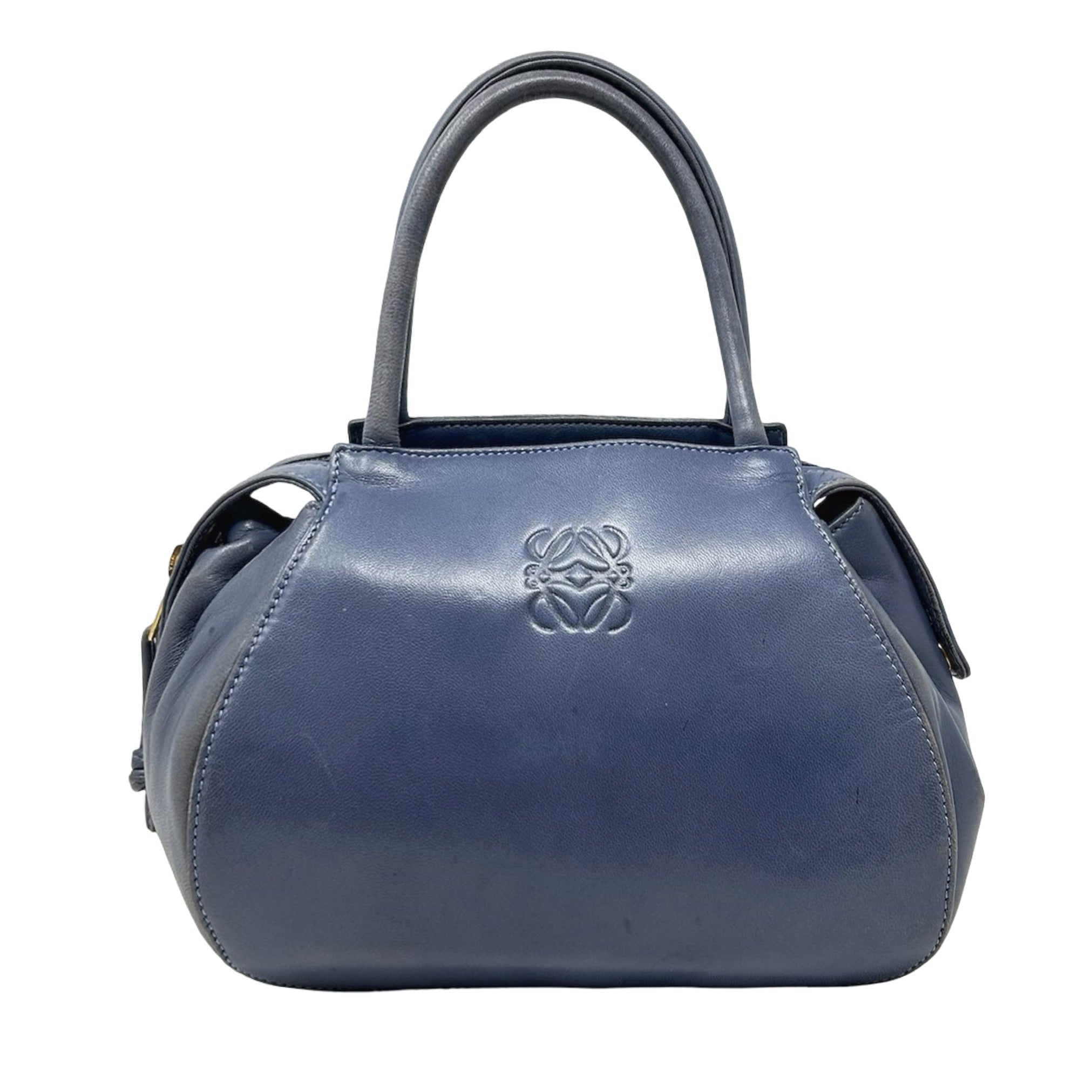 Description: Blue Loewe vintage top handle bag in buttery leather with tonal stitching, top zip closure, Loewe anagram logo embossed at front centre, gold tone hardware, logo embossing on zipper, tonal leather zipper pull tab, dual rolled leather handles, dual exterior slip pockets, black nylon lining, single interior zip pocket, and interior gold toned logo plate.