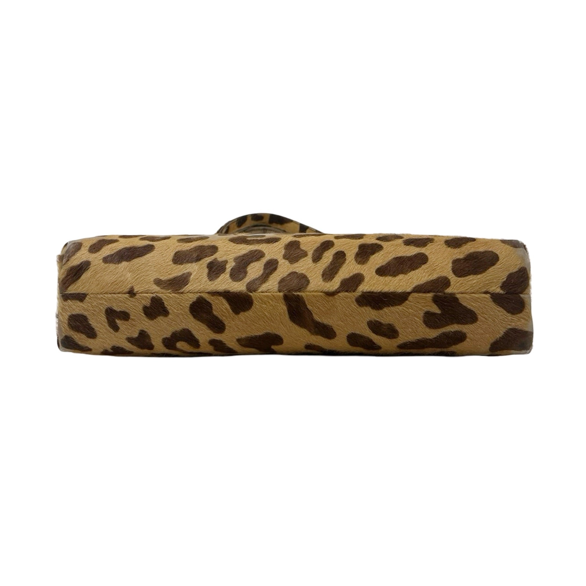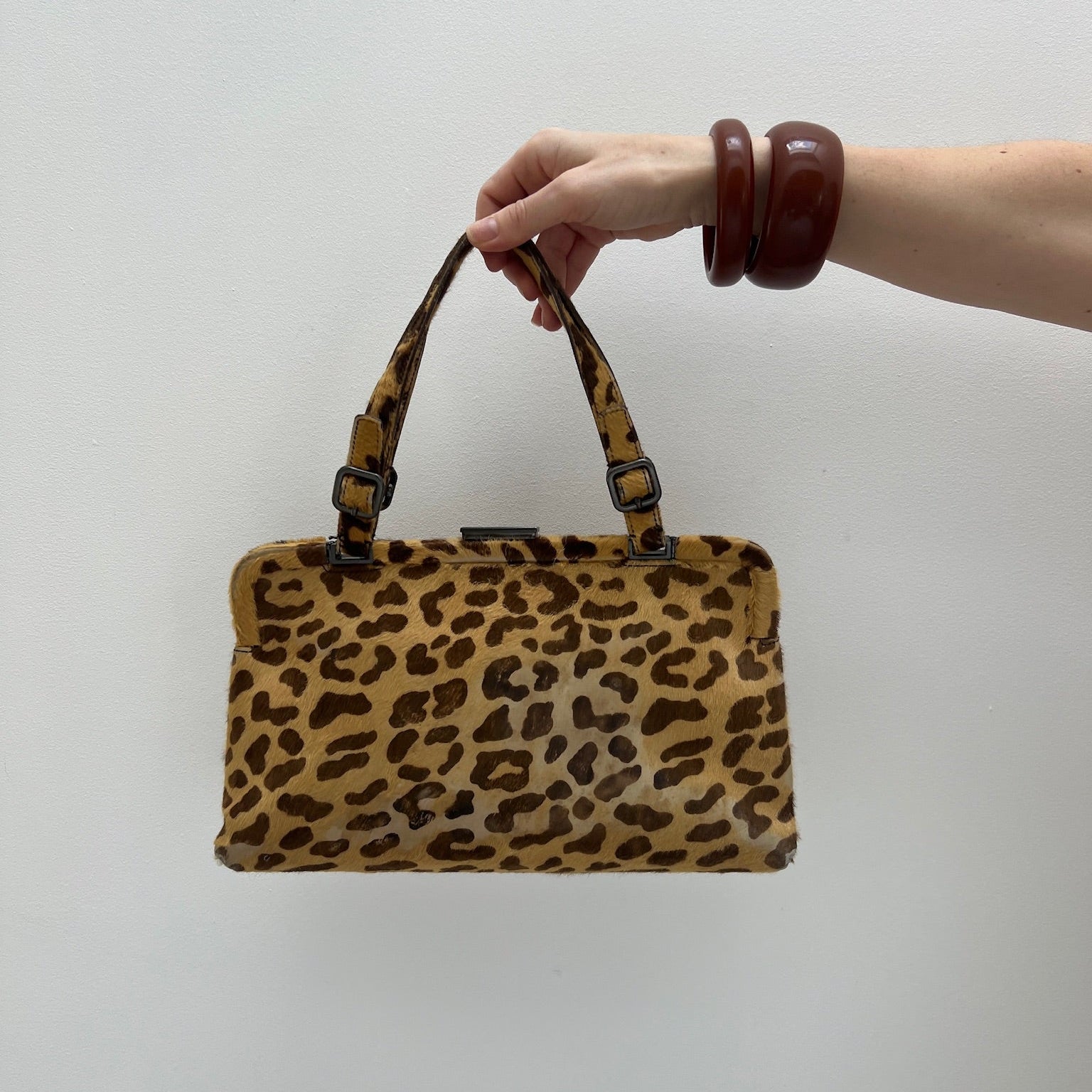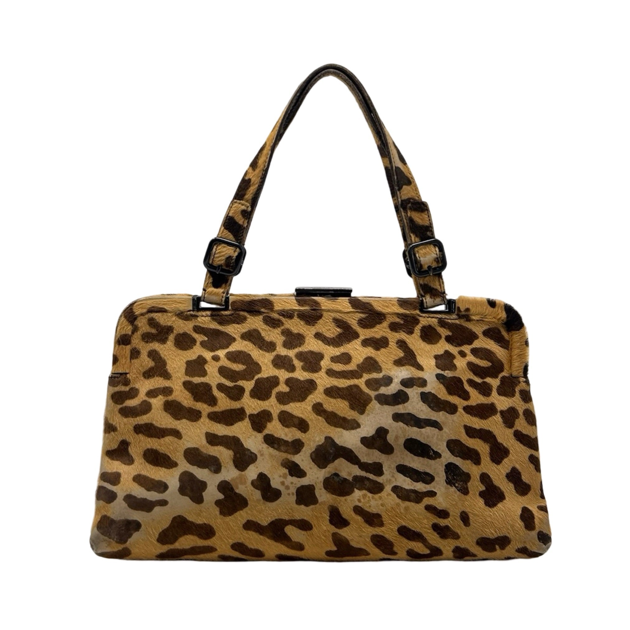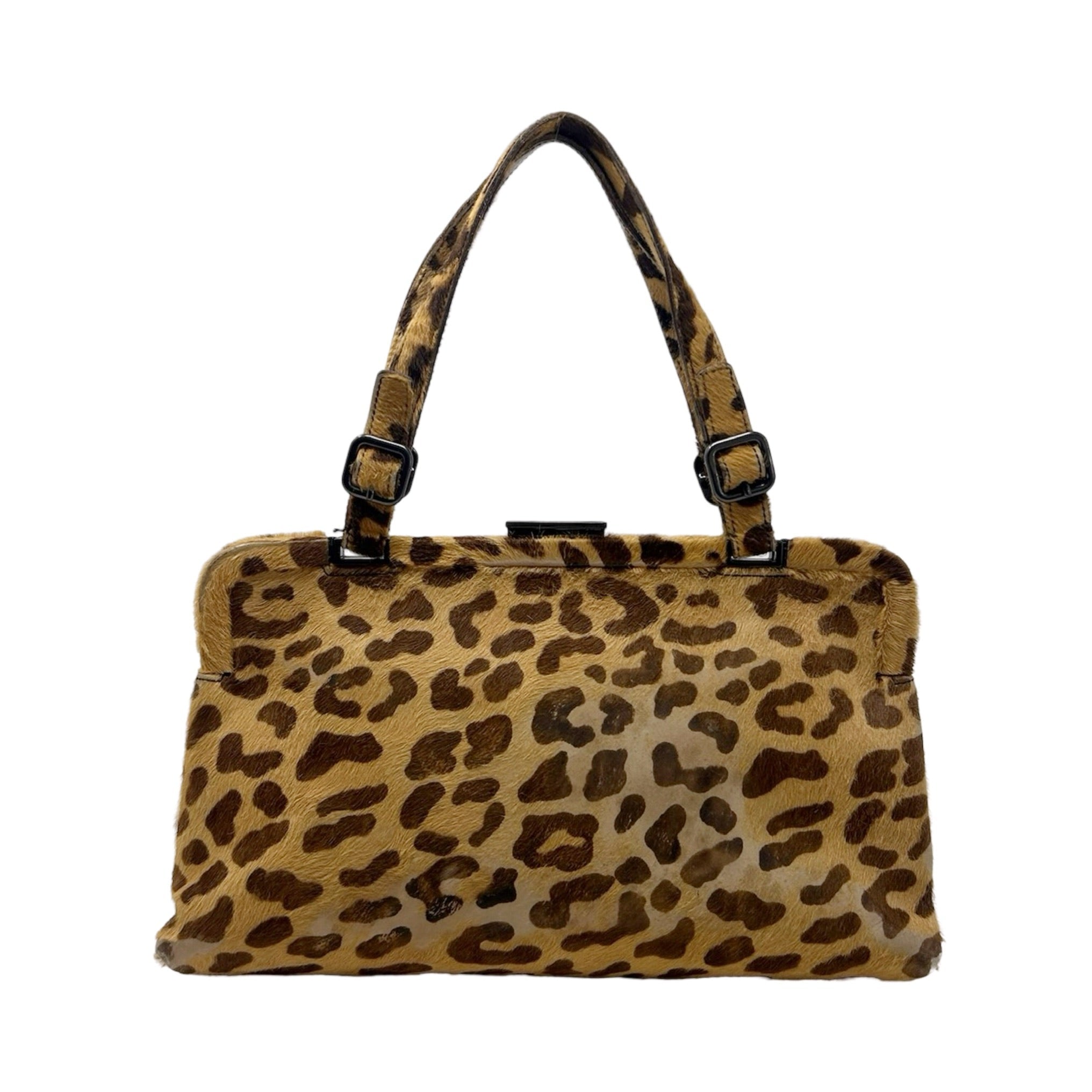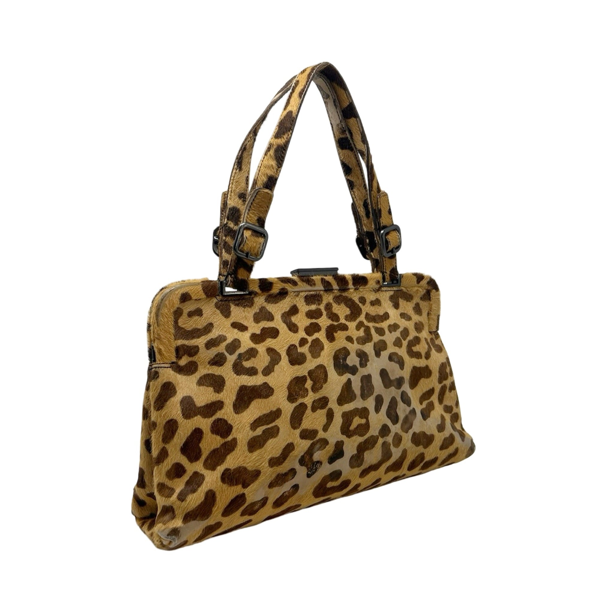 Description - Vintage animal print Prada calf hair frame top handle bag with dual flat top handle straps, gunmetal hardware, leather trim embellishment, snap closure at top, logo jacquard lining and single zip interior pocket.