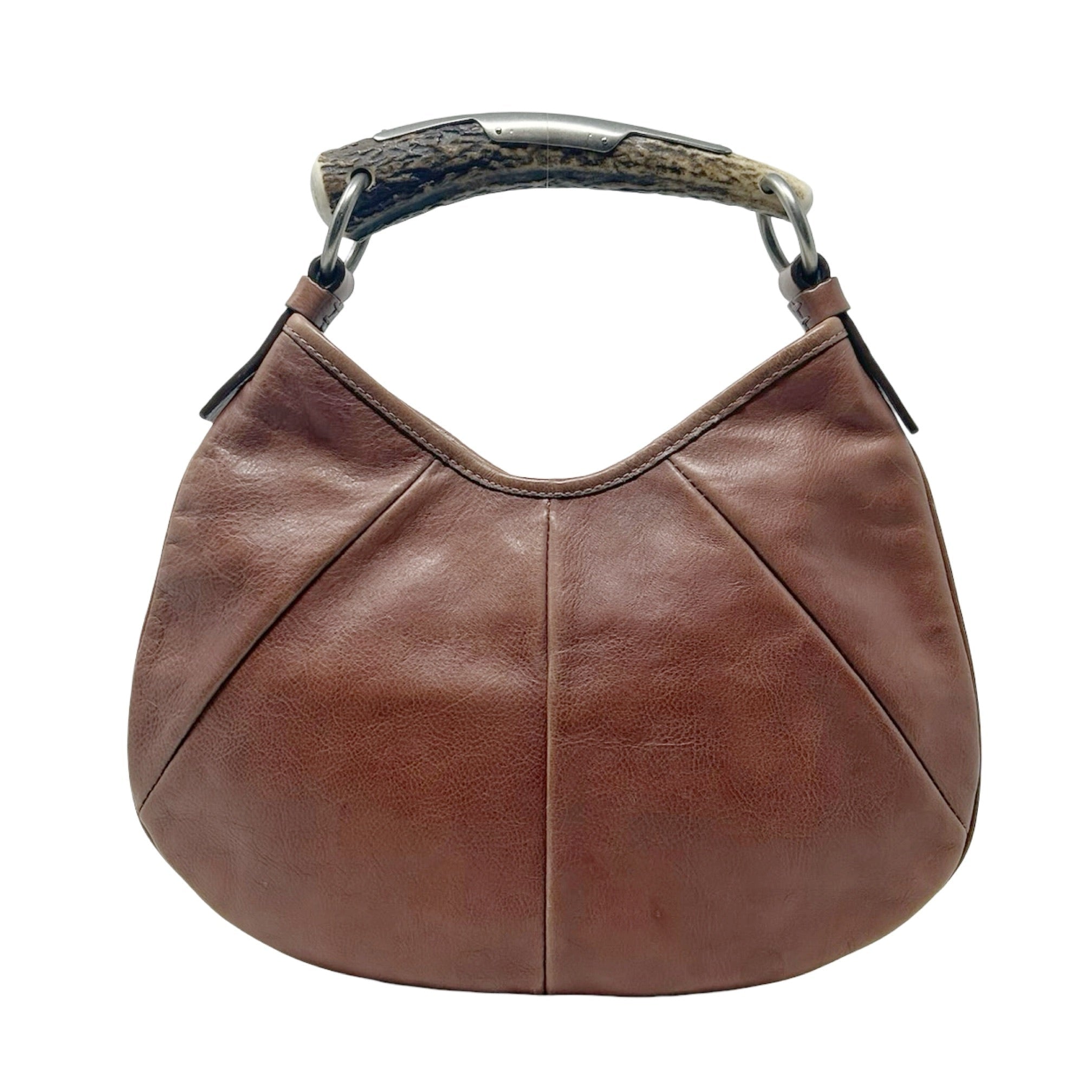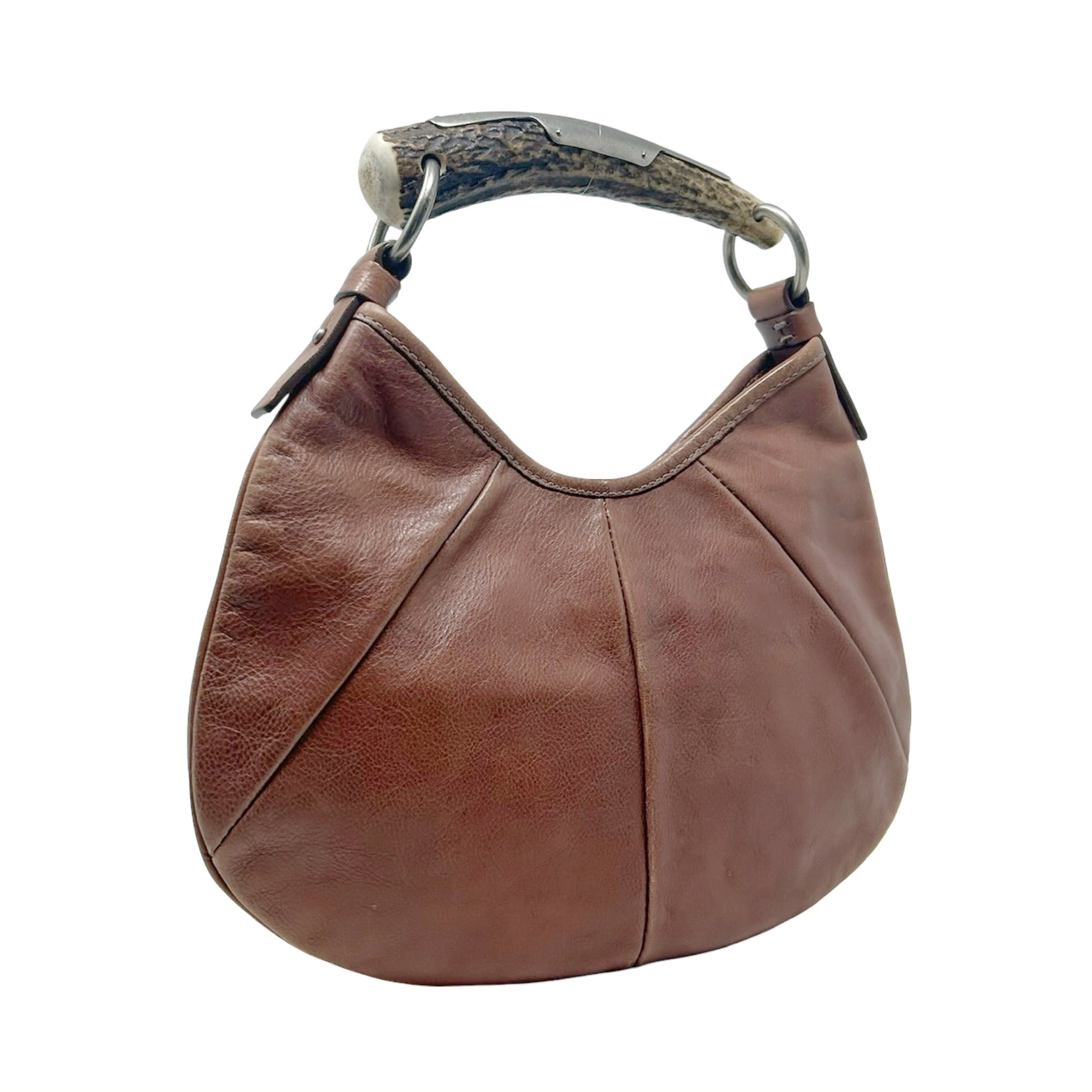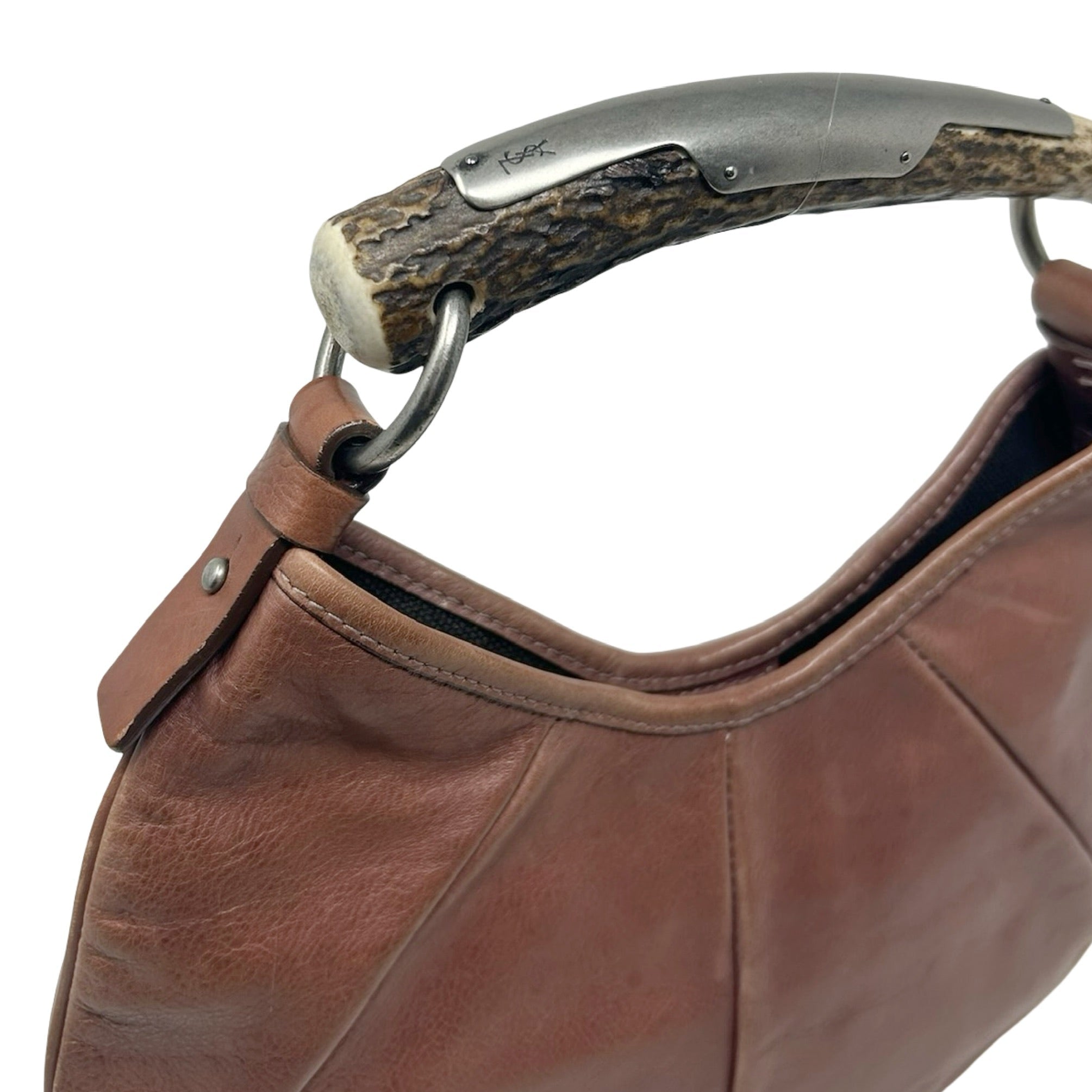 Description - Vintage Yves Saint Laurent Rive Gauche brown leather Mombasa shoulder bag with silver tone hardware, single horn/metal top handle embossed with YSL logo, snap closure at top and single interior pocket.