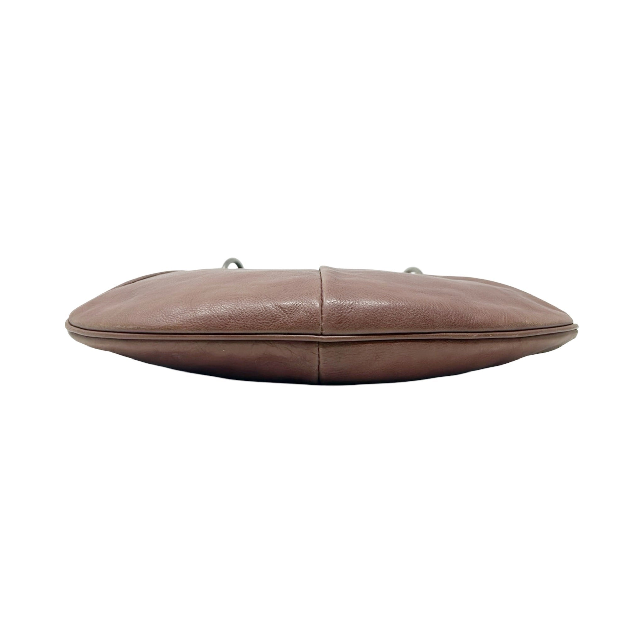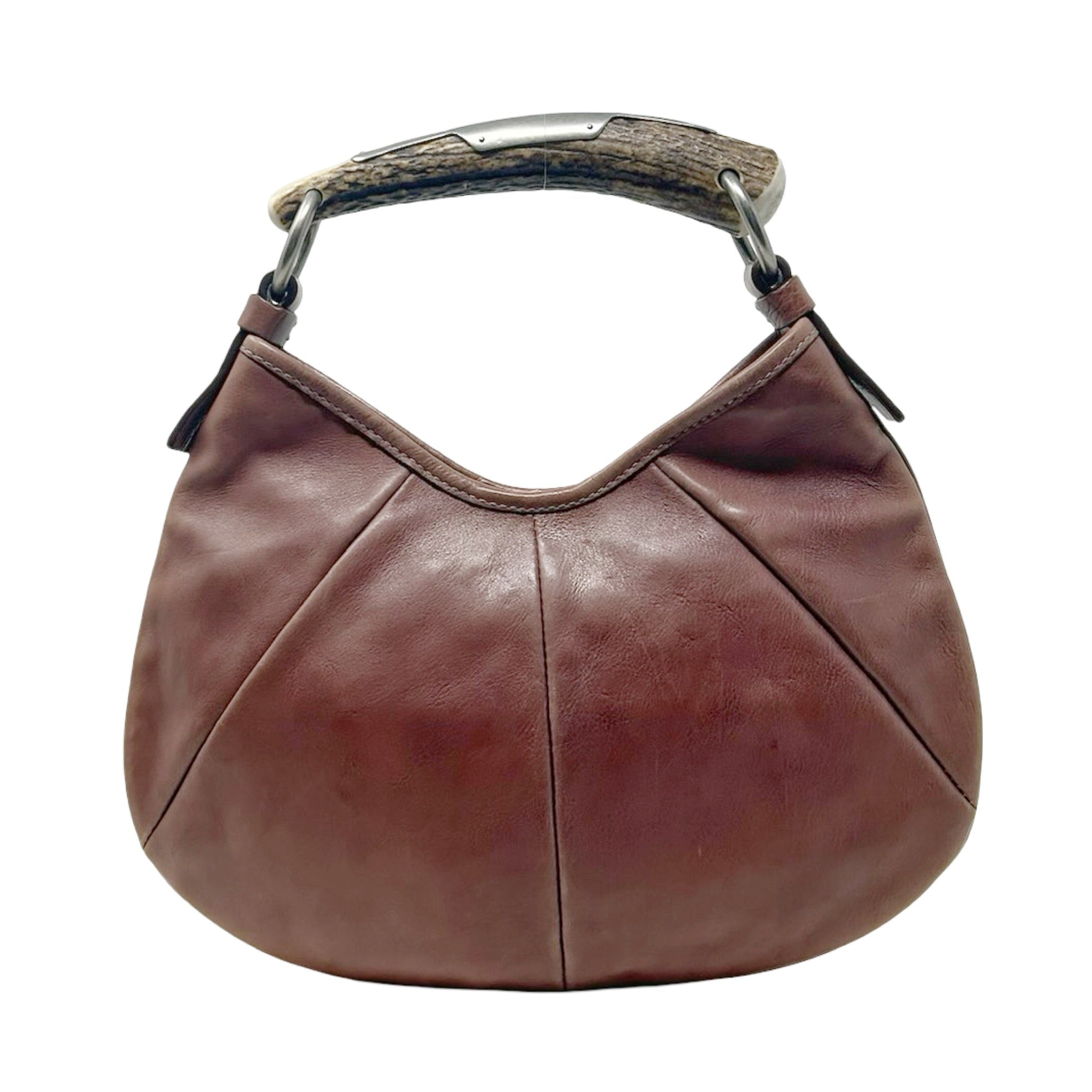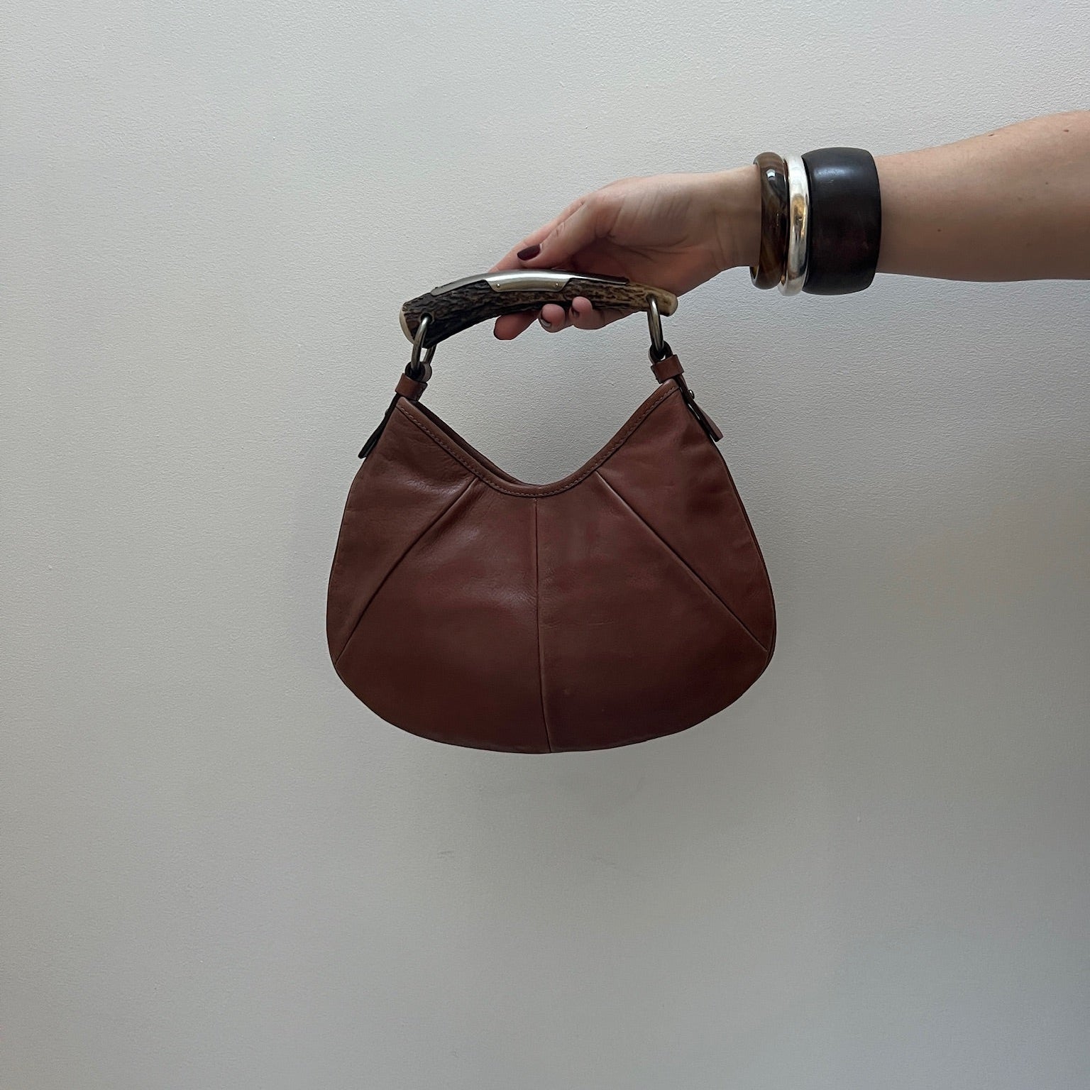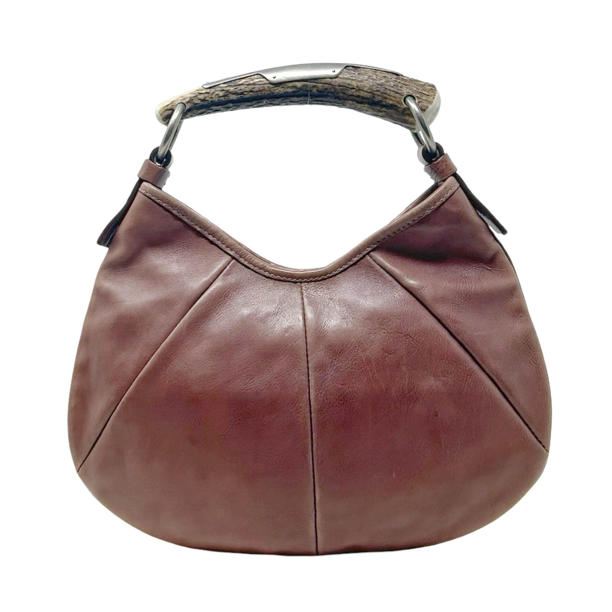 Description - Vintage Yves Saint Laurent Rive Gauche brown leather Mombasa shoulder bag with silver tone hardware, single horn/metal top handle embossed with YSL logo, snap closure at top and single interior pocket.