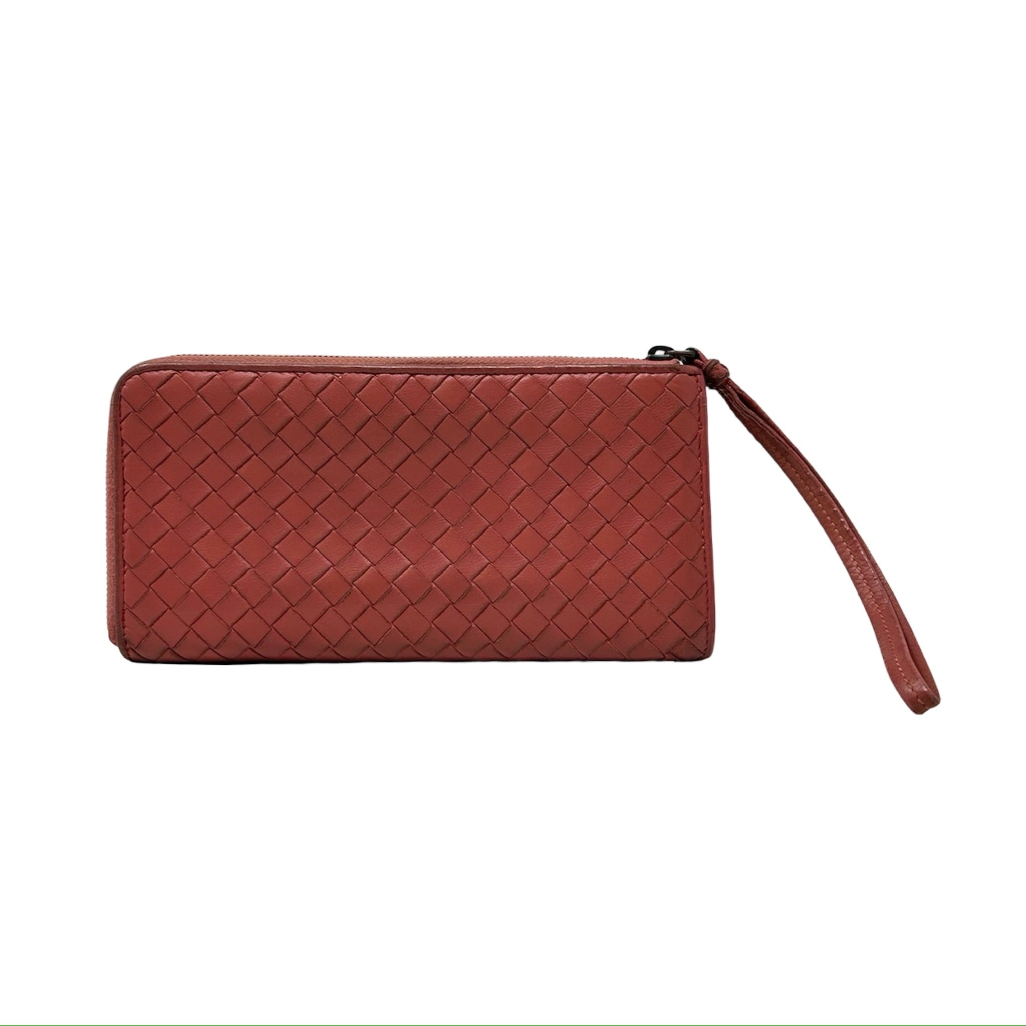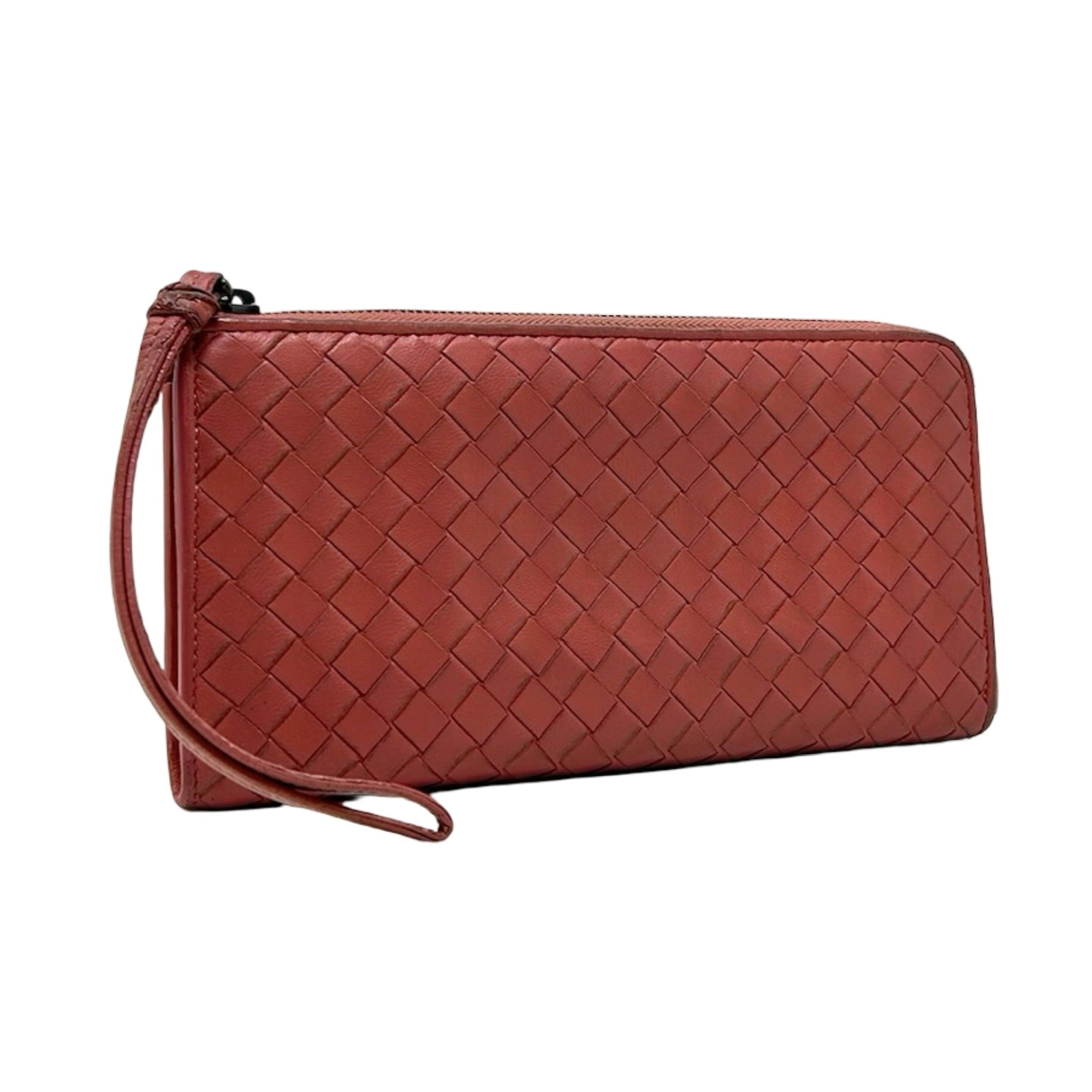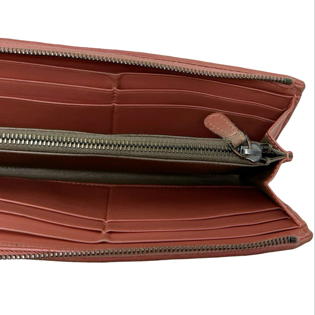Description - 00's dusty rose Bottega Veneta continental wallet with Intrecciato weave throughout, zip around closure, tonal leather zipper pull, gunmetal hardware, two tone leather lining, two interior bill slots, eight card slots, single interior zip up pocket.