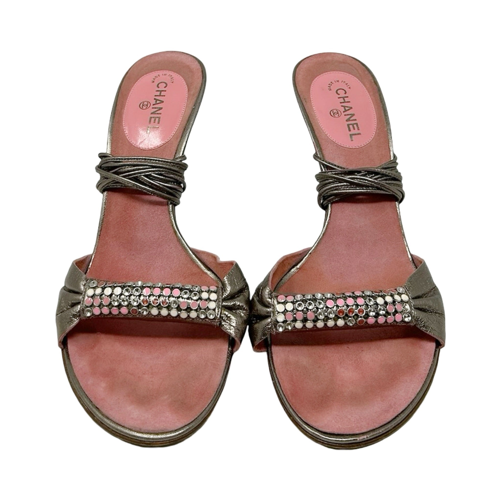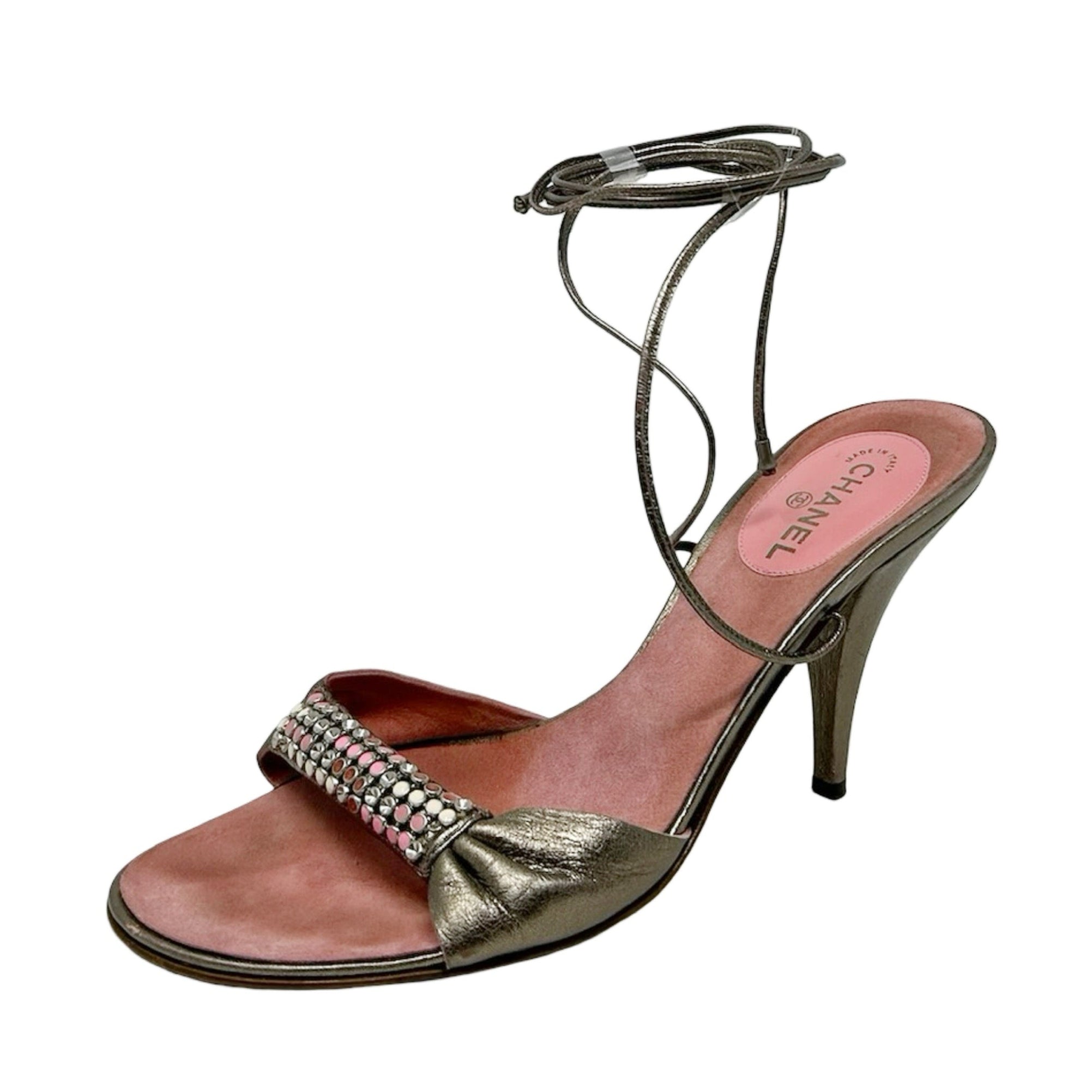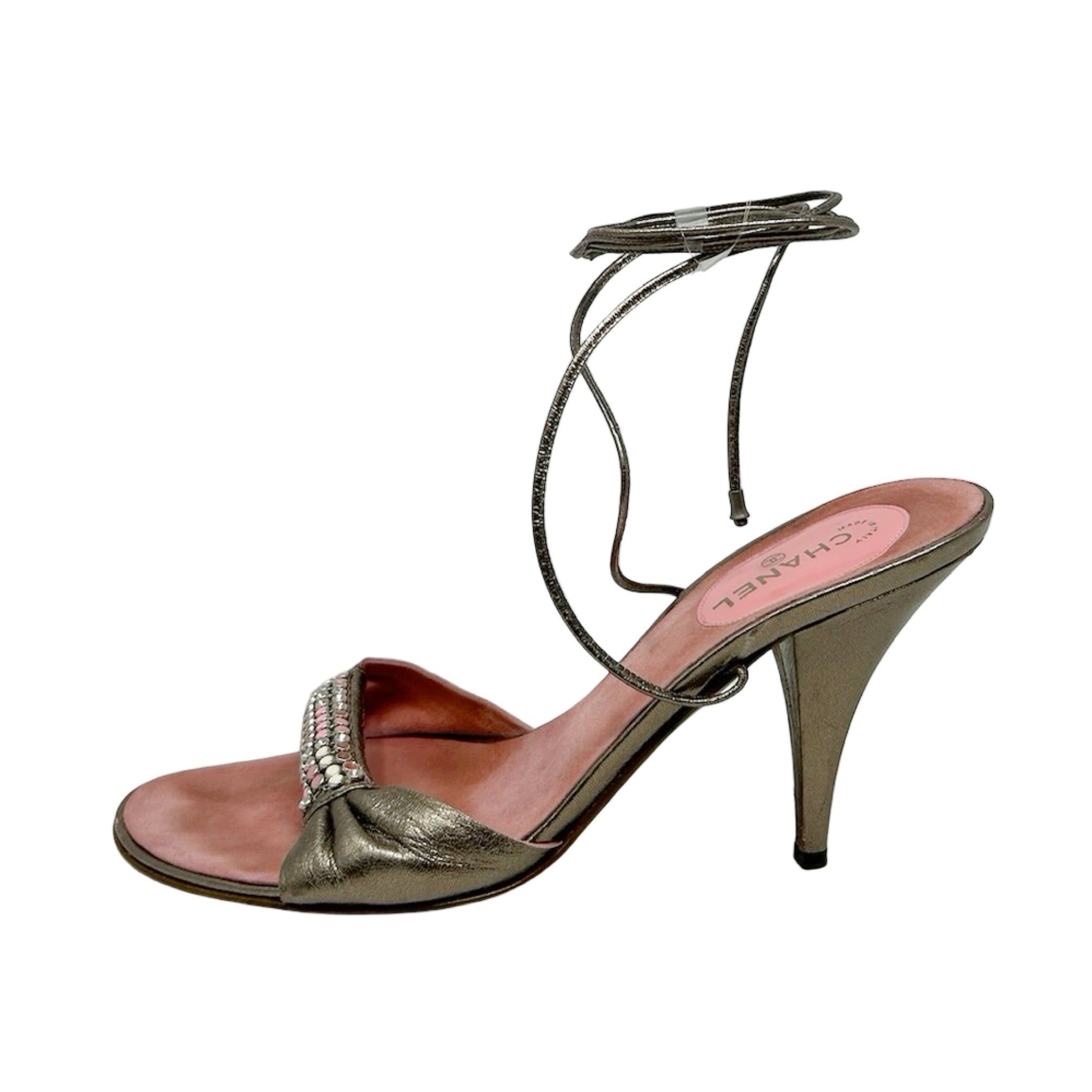 Description - Vintage Chanel rhinestone lace up sandals in metallic gunmetal leather, with covered stiletto heels, rounded toes, pink/white rhinestone embellishment at toes.