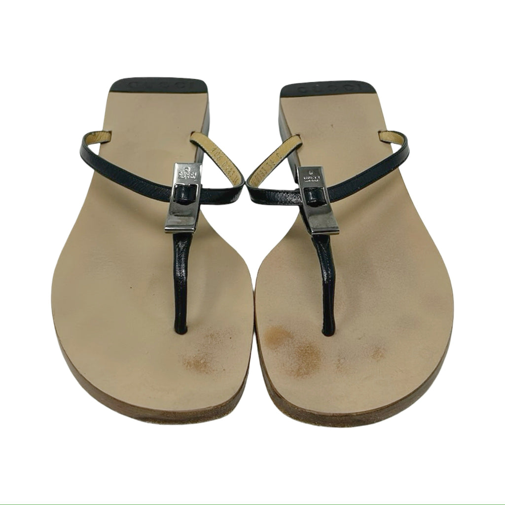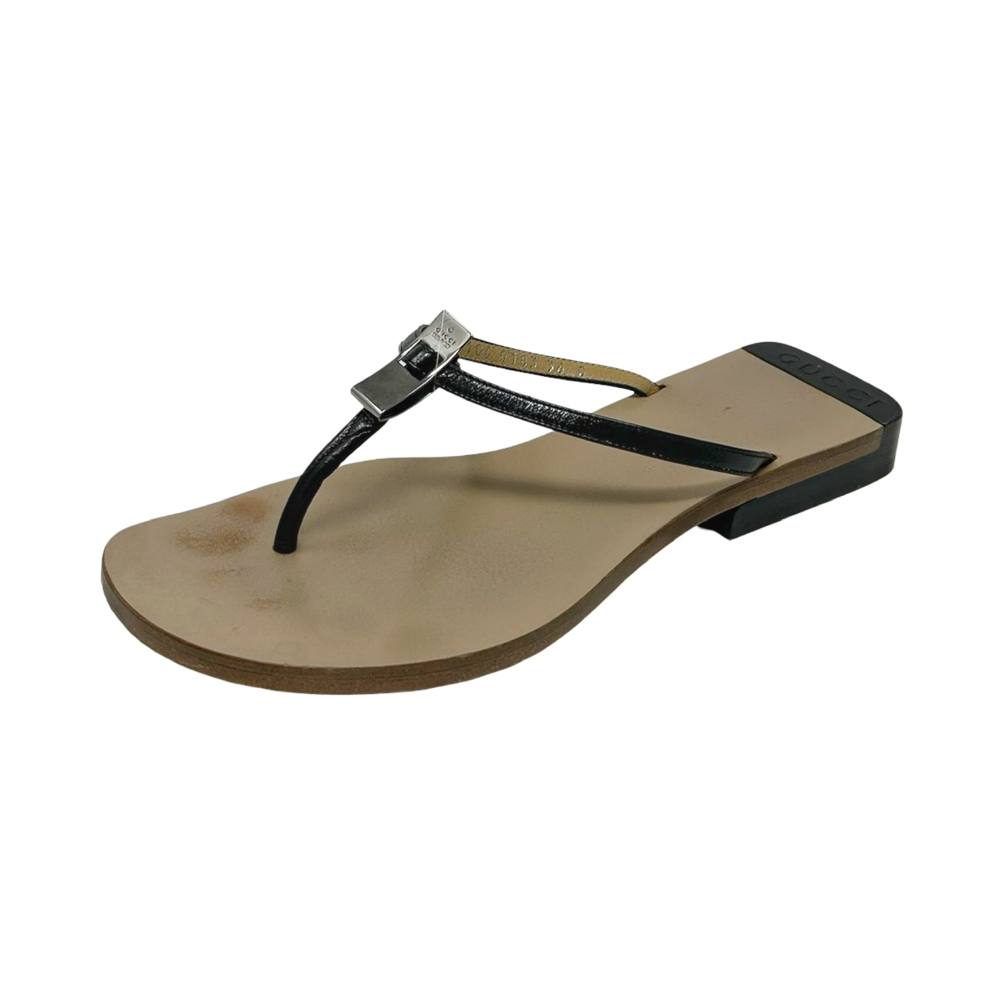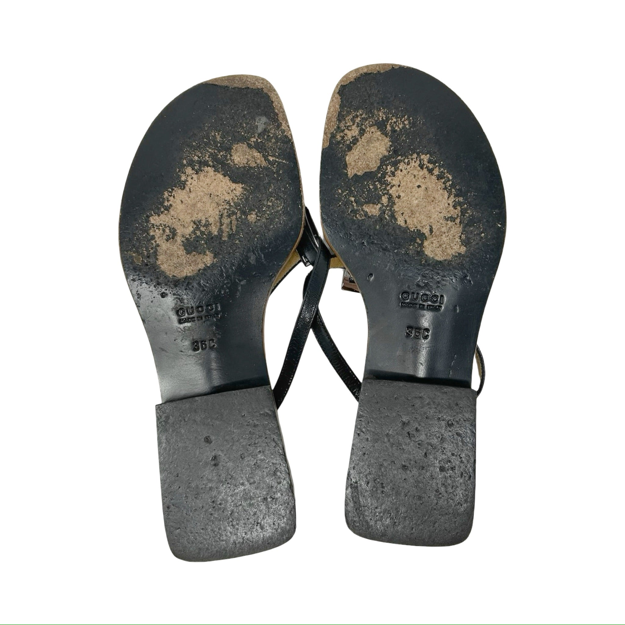 Description - Early 2000's black patent leather Gucci flip flop sandals with silver toned logo plate at toe, Gucci logo embossing at heel, wooden sole, and round shaped toes.