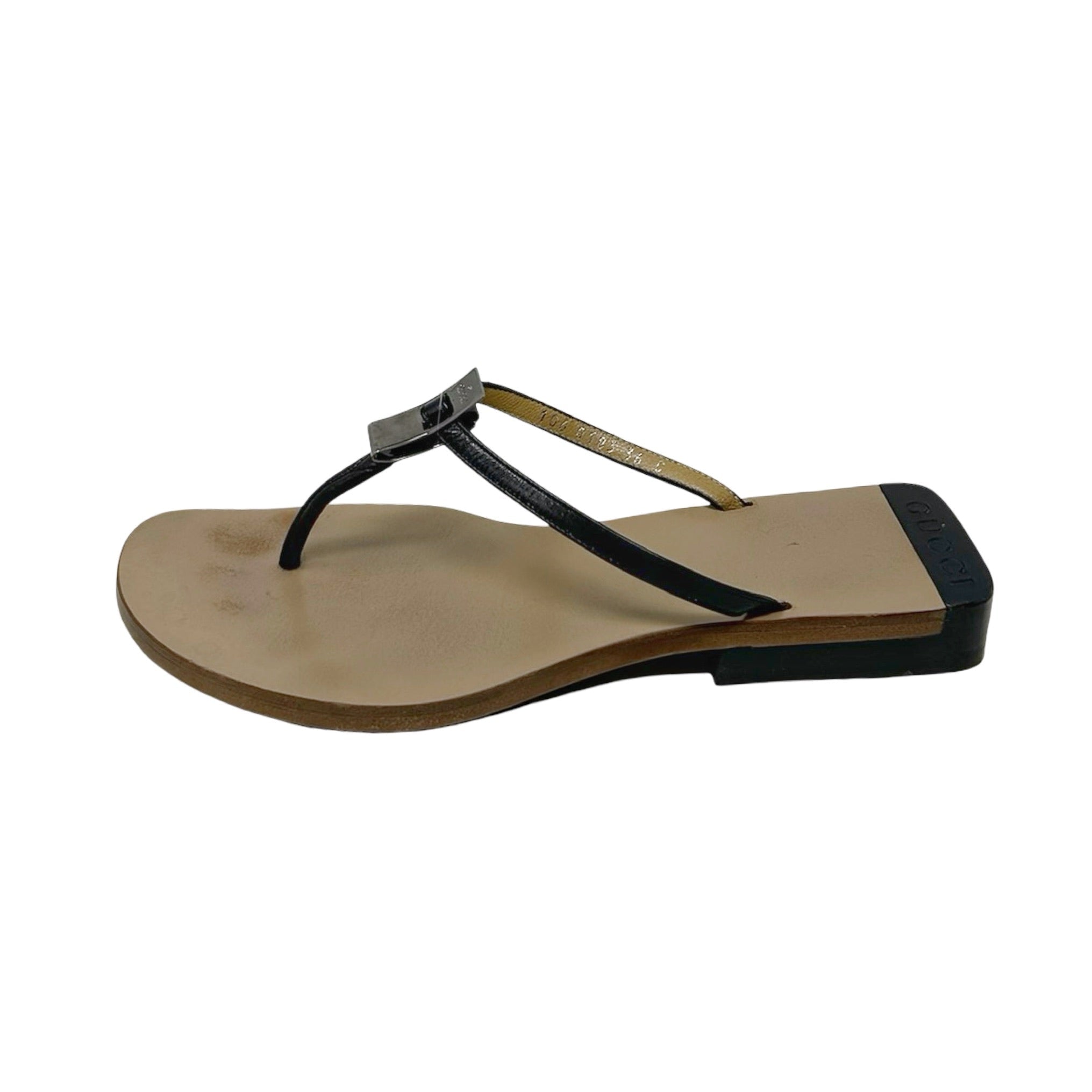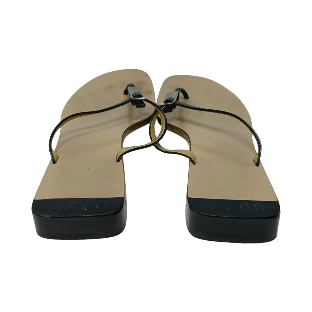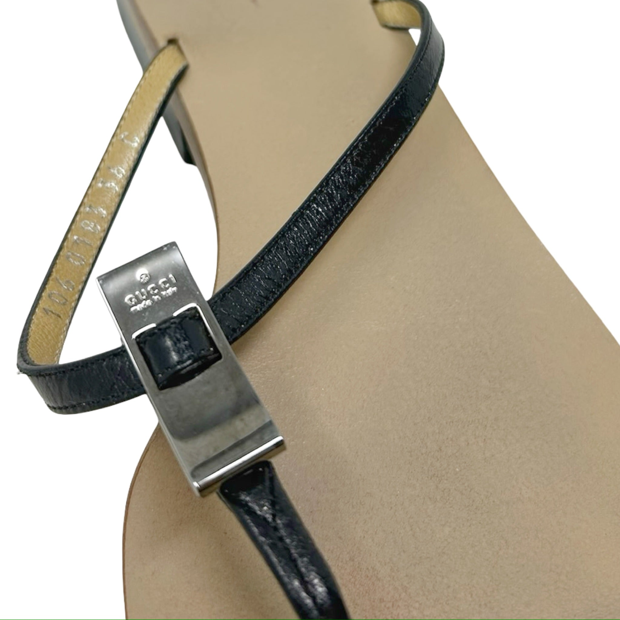 Description - Early 2000's black patent leather Gucci flip flop sandals with silver toned logo plate at toe, Gucci logo embossing at heel, wooden sole, and round shaped toes.