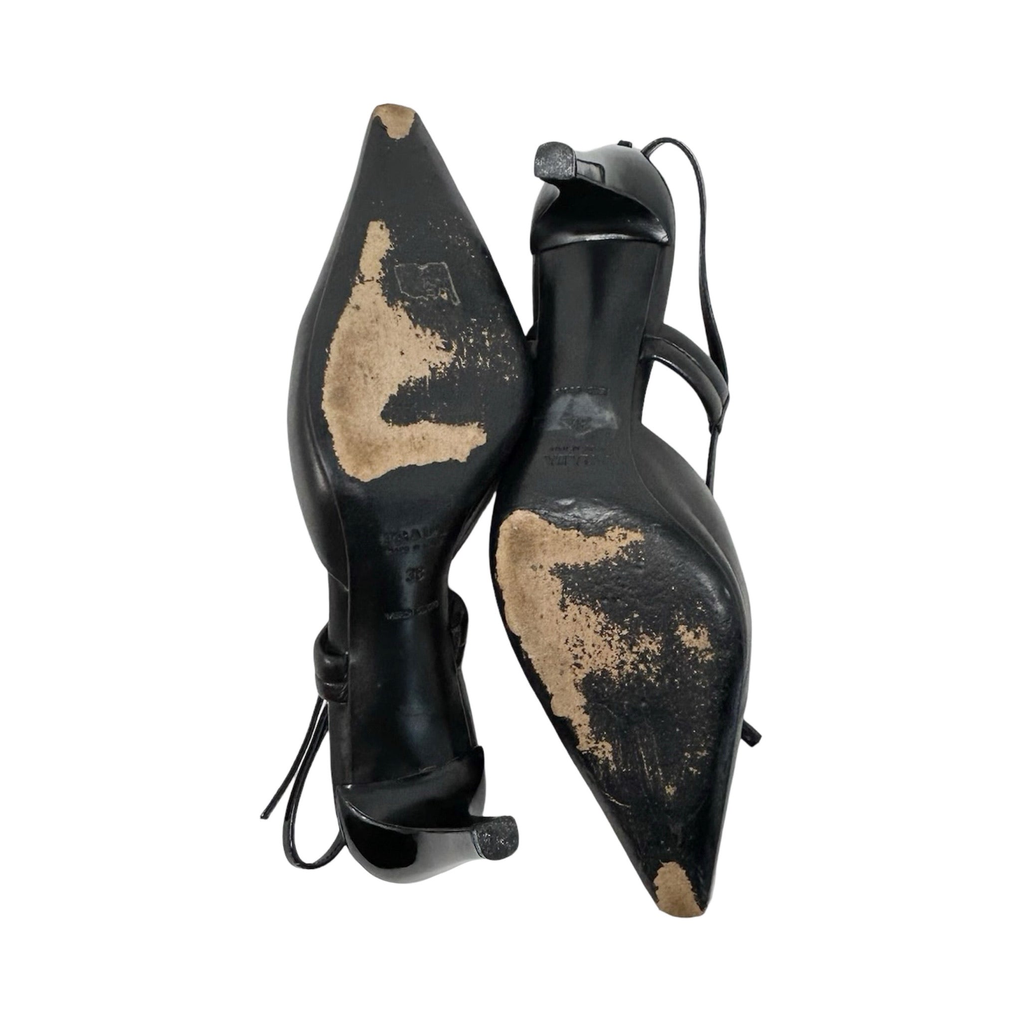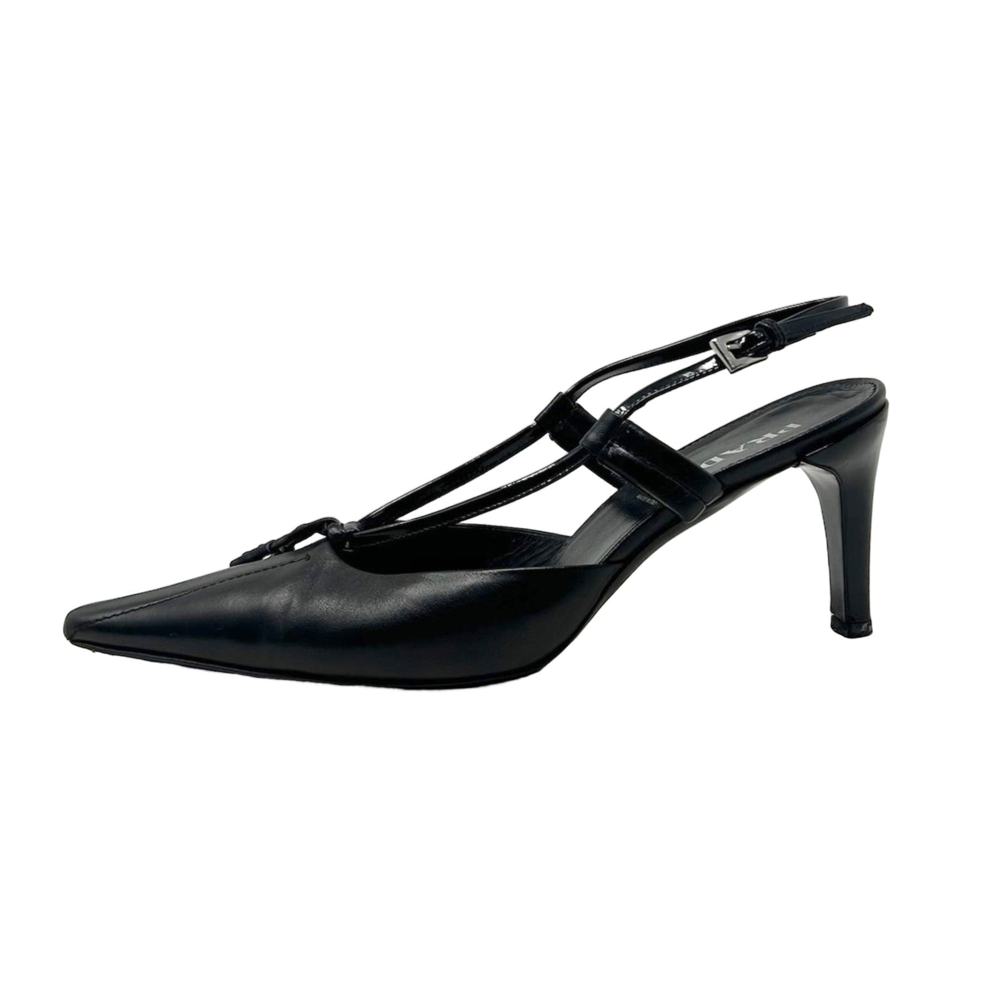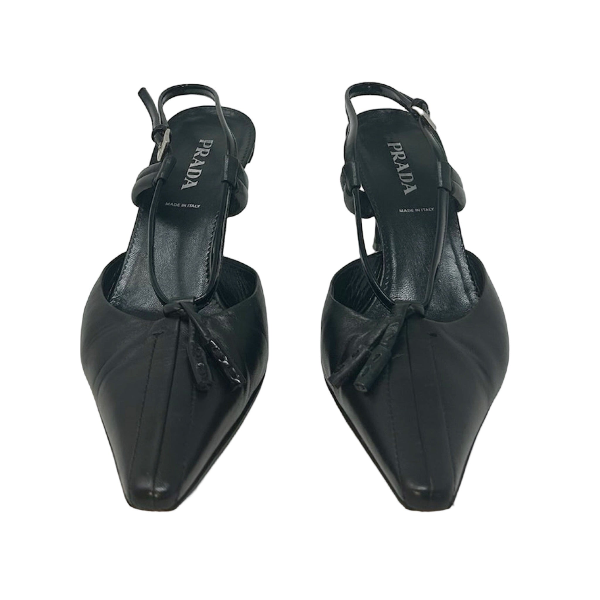 Description - Vintage black leather Prada slingback heels with tonal strappy patent leather embellishments, silver tone hardware, adjustable ankle strap, tassel detail at front, and pointed toes.
